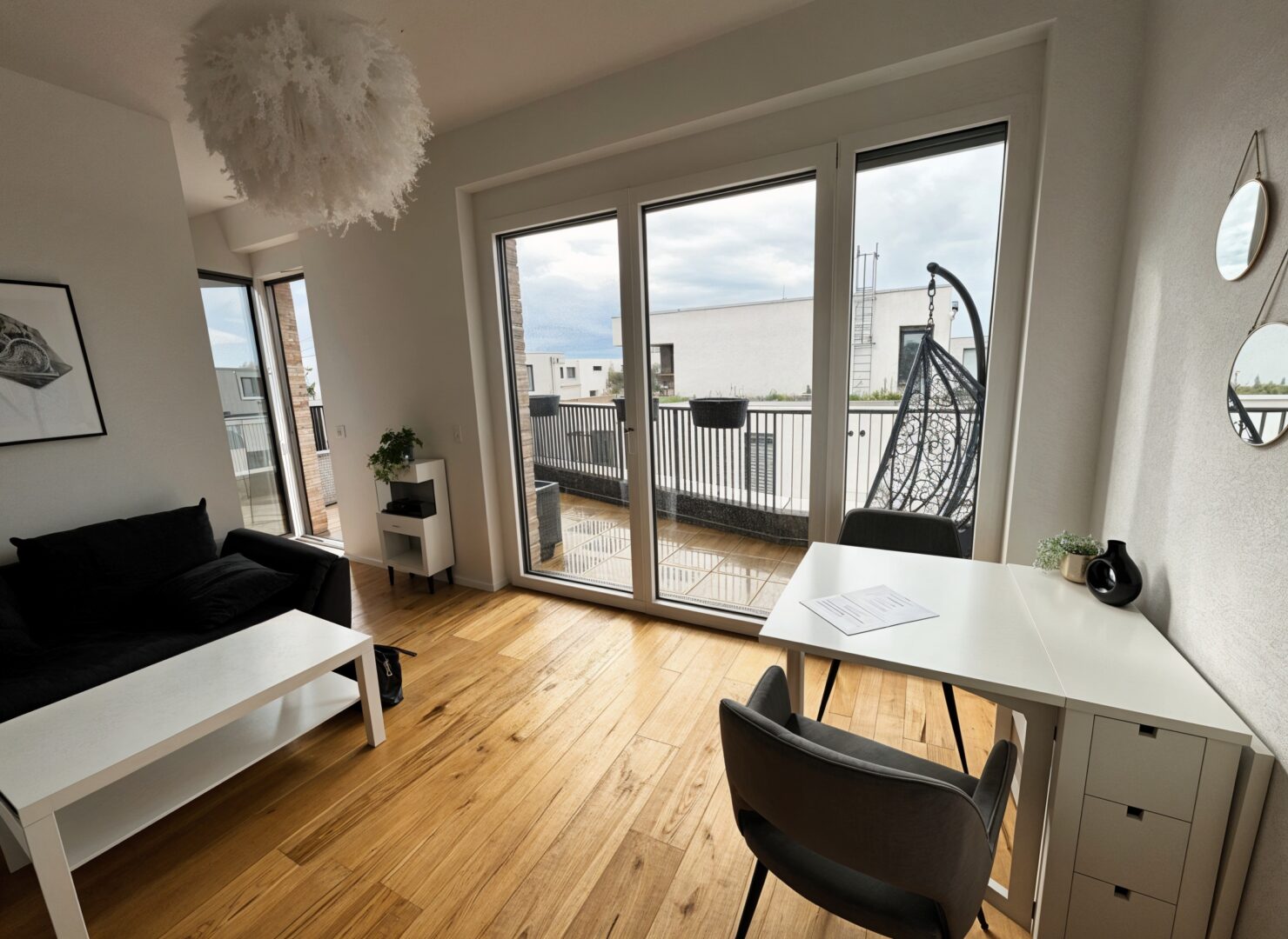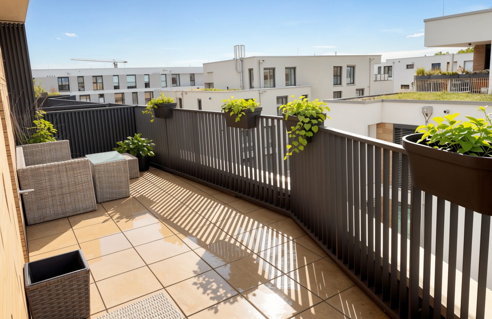 Der großzügige Balkon erweitert den Wohnraum nach außen und lässt sich an sonnigen Tagen wunderbar als zweites Wohnzimmer nutzen – ideal zum Entspannen nach der Arbeit oder für ein Glas Wein am Abend.