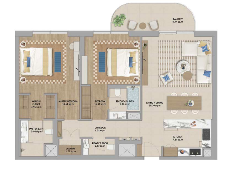 Beim Betreten der Wohnung empfängt Sie ein geräumiges Wohnzimmer, von dem aus Sie Zugang zu den zwei Schlafzimmern haben. Jedes der Schlafzimmer verfügt über einen begehbaren Kleiderschrank, in dem Sie all Ihre Kleidung und Accessoires ordentlich verstauen können. Das Badezimmer ist modern ausgestattet und bietet genügend Platz für Entspannung nach einem langen Tag.