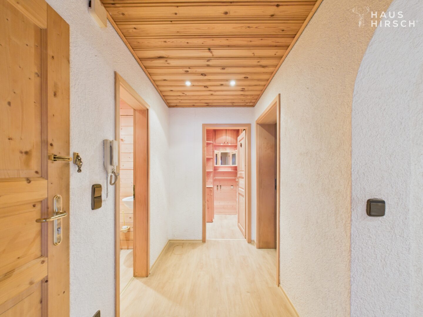 Die Wohnung ist in einer ansprechenden Holzoptik gestaltet, was für ein angenehm warmes Wohngefühl sorgt.