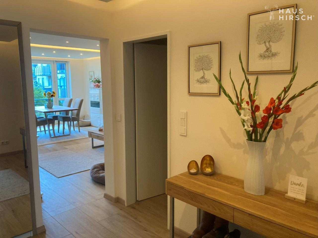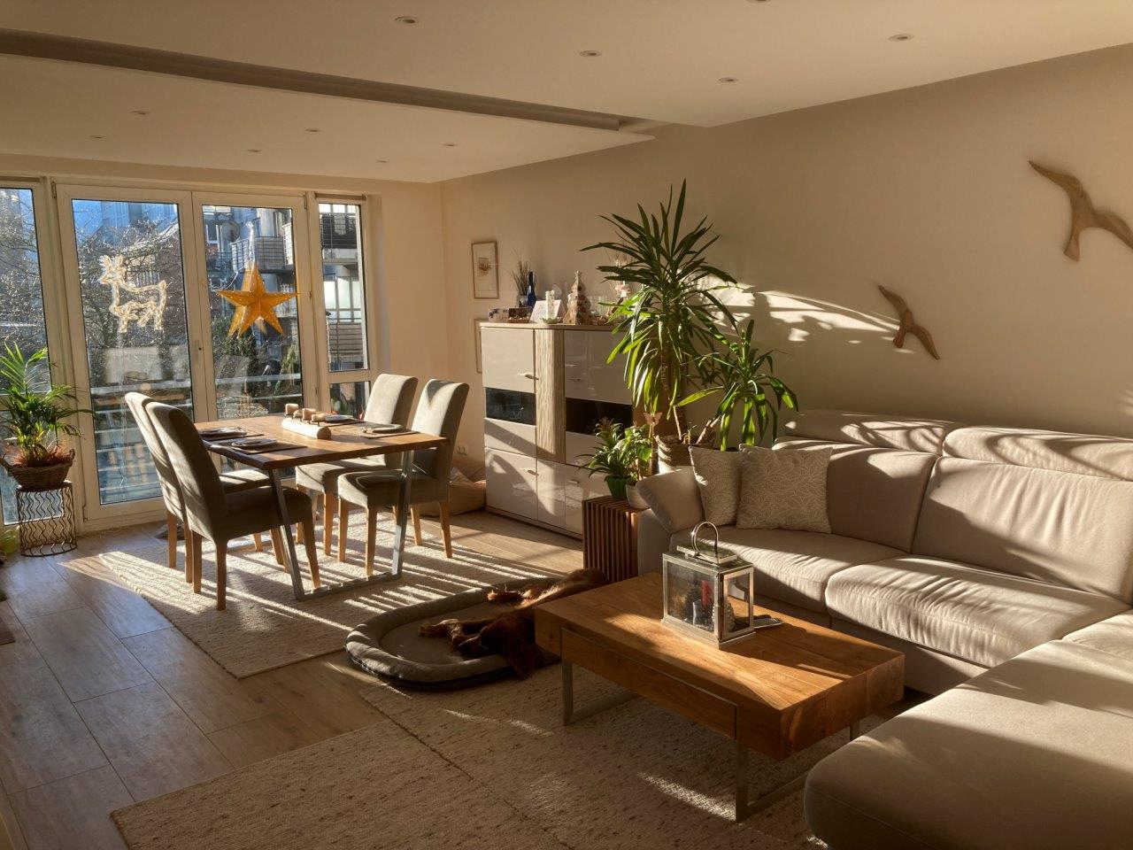 Beim Betreten der Wohnung fällt direkt die hochwertige Einrichtung auf. Die Eingangstür ist einbruchssicher, was ein Gefühl der Sicherheit vermittelt. Fußbodenheizung in allen Zimmern, Steinfliesen in Holz-Optik und indirekte LED-Beleuchtung schaffen eine behagliche Atmosphäre.