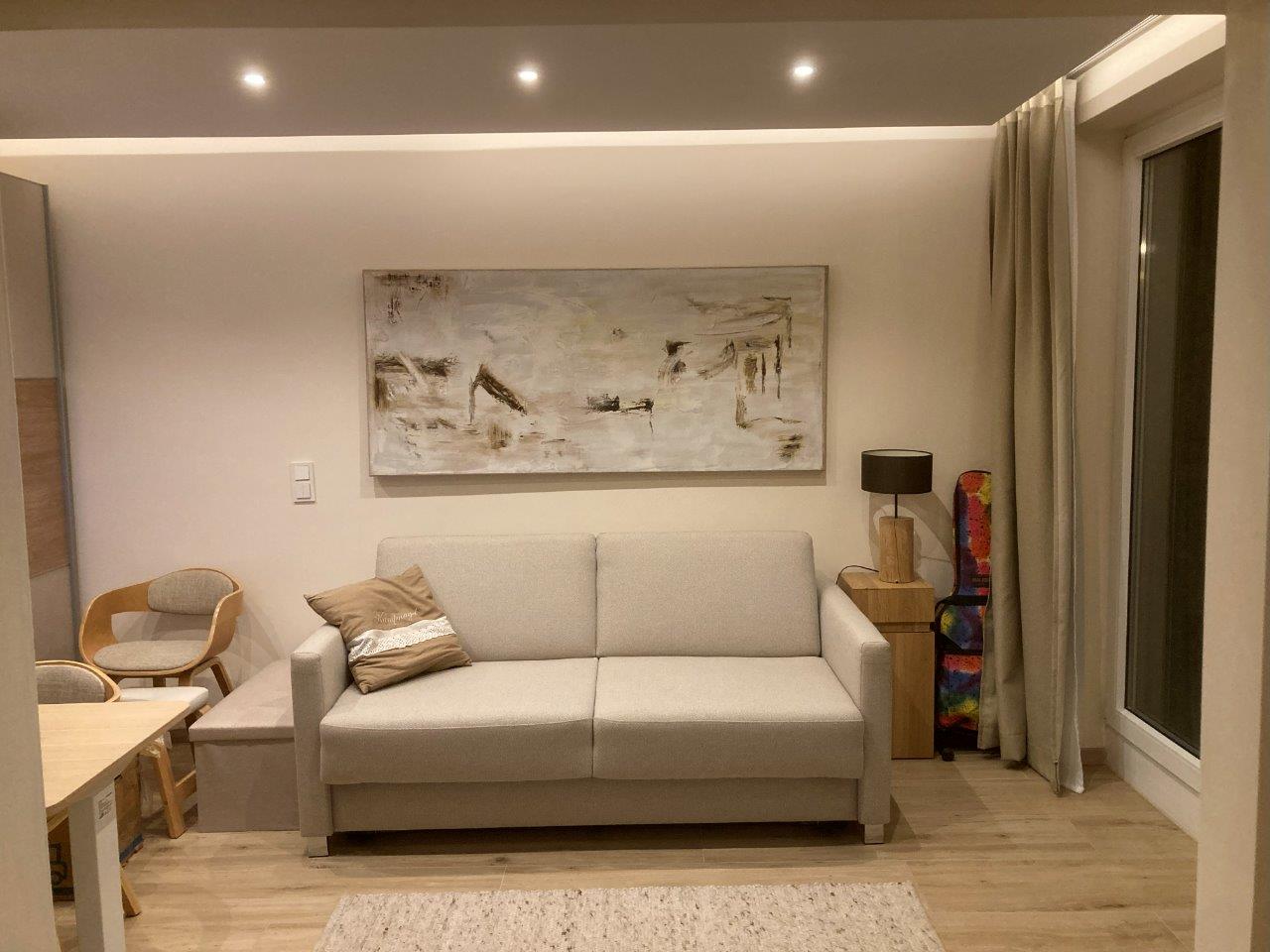Die Beleuchtung setzt sich aus indirektem und direktem Spot- Licht zusammen, alle Kreise sind stufenlos dimmbar per Schalter und Bluetooth. Die Wohnung ist zudem mit einer hochwertigen Isolierung und einer leisen Luftungsanlage im Schlafzimmer ausgestattet.