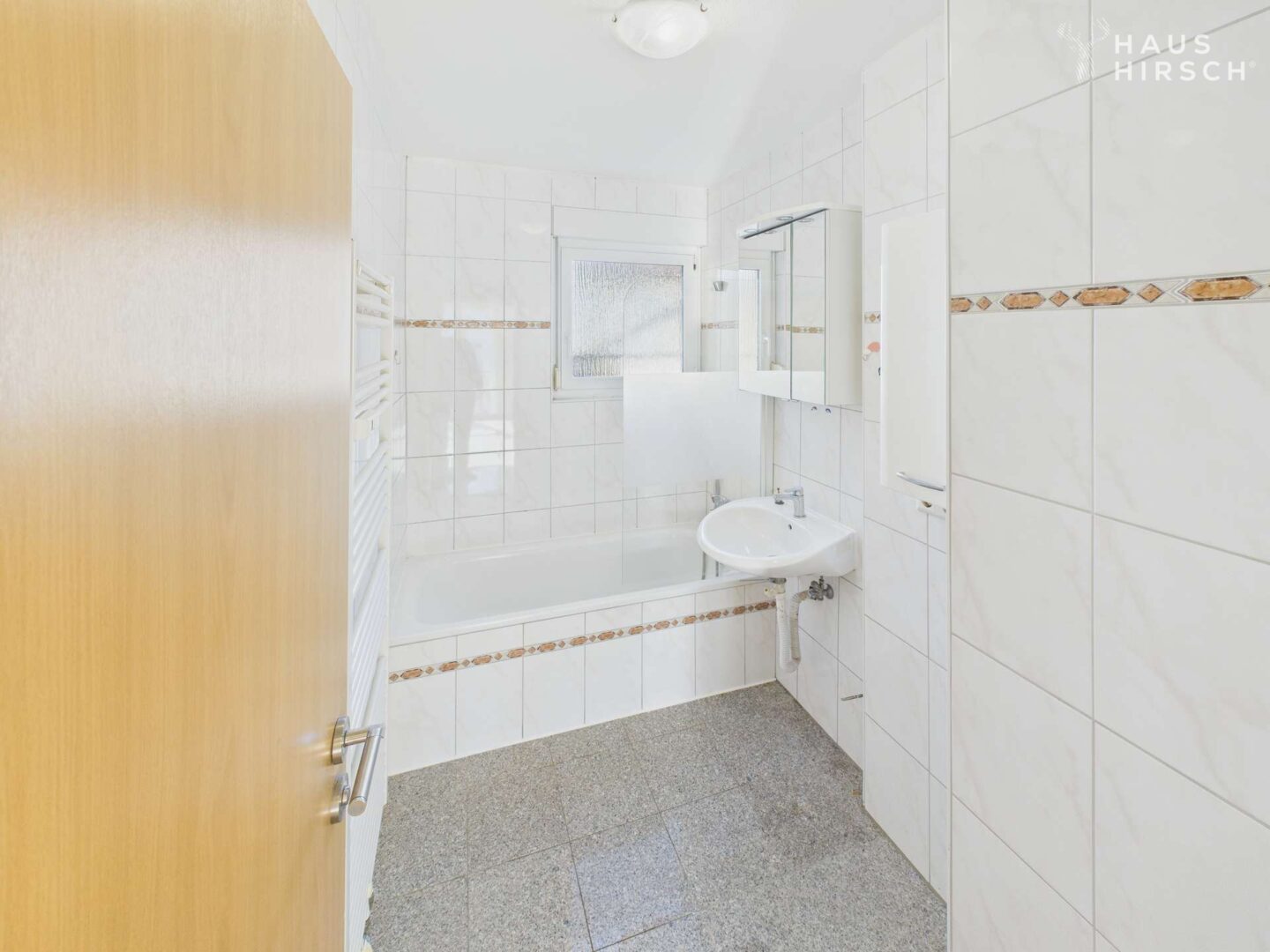 Praktisch geschnitten und funktional ausgestattet, mit Badewanne, Waschtisch, Handtuchheizkörper und Fenster – ideal für natürliches Licht und gute Belüftung.