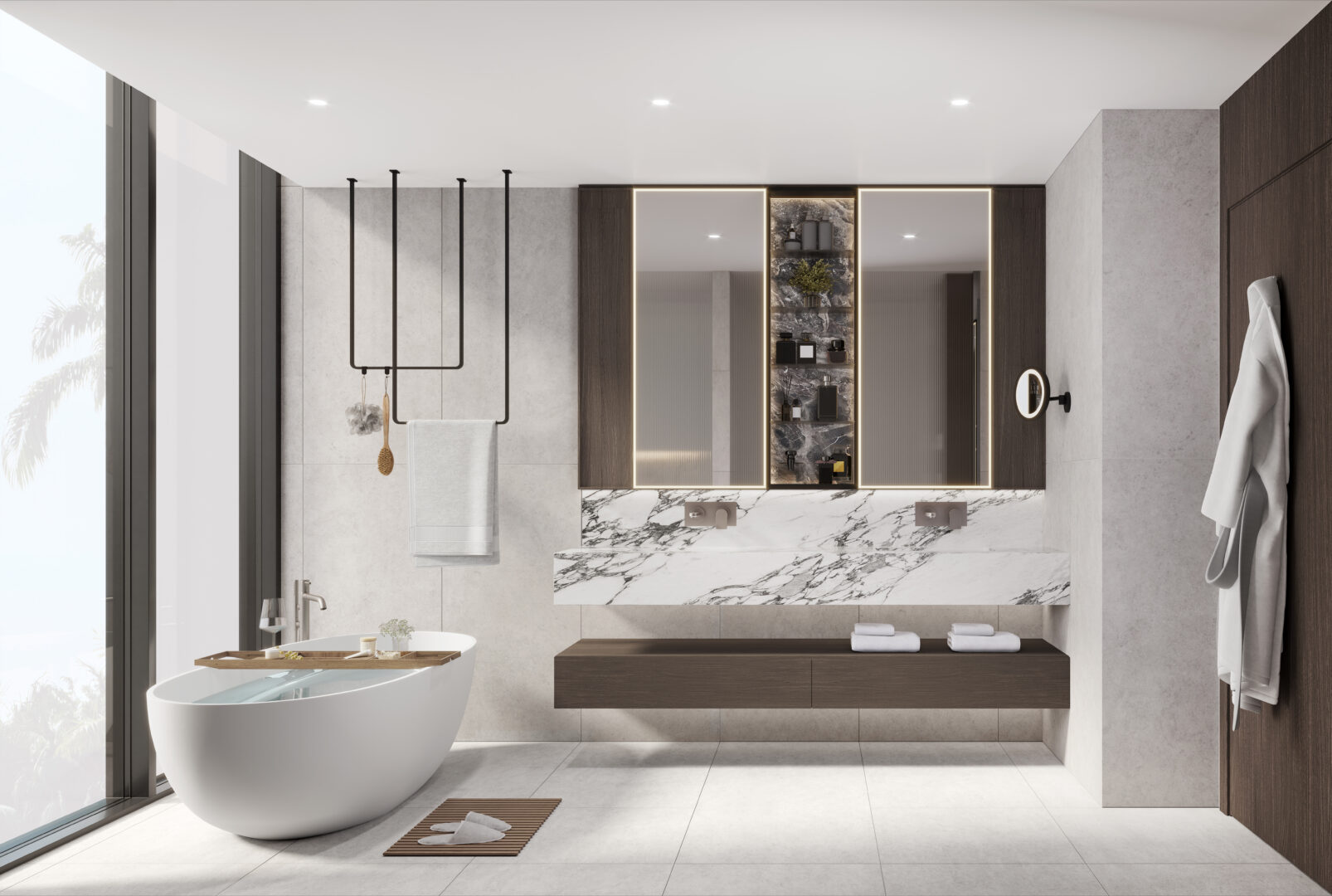 Entspannen Sie in einem der Schlafzimmer, die jeweils über ein eigenes Badezimmer und begehbare Kleiderschränke verfügen. Genießen Sie die einstellbaren Lichtstimmungen in den Schlafzimmern und lassen Sie sich in der freistehenden Badewanne mit Fensterblick verwöhnen.