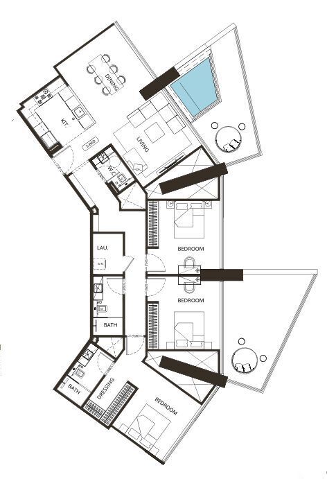 Willkommen in Ihrem zukünftigen Zuhause! Betreten Sie das beeindruckende Wohnzimmer mit bodentiefen Fenstern, die für eine helle und luftige Atmosphäre sorgen. Von hier aus haben Sie Zugang zu Ihrem eigenen privaten Pool auf dem Balkon, wo Sie sich an warmen Tagen erfrischen können.