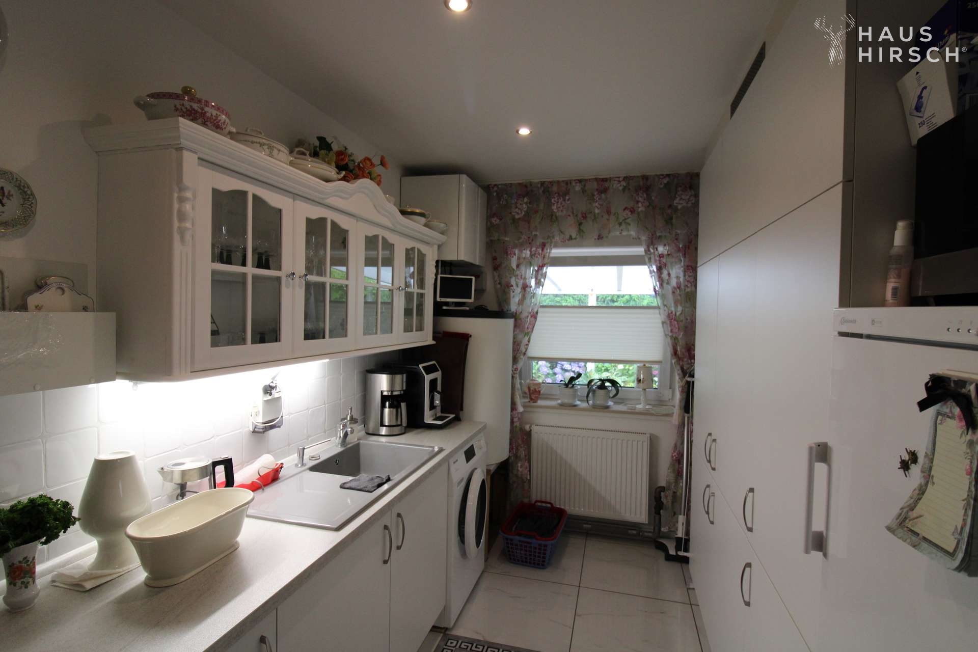 Die geräumige Wohnküche ist mit einer hochwertigen Einbauküche ausgestattet und bietet Zugang zum Hauswirtschaftsraum sowie zur großen Garage mit elektrischem Rolltor. Von hier aus gelangt man auf die edel geflieste und überdachte ca. 50 m² große Terrasse, die zum Entspannen und geselligen Beisammensein einlädt.