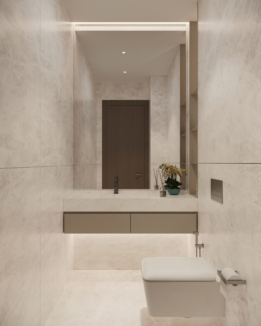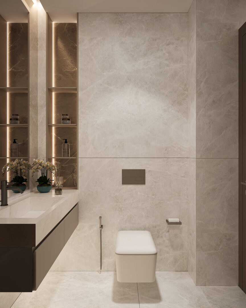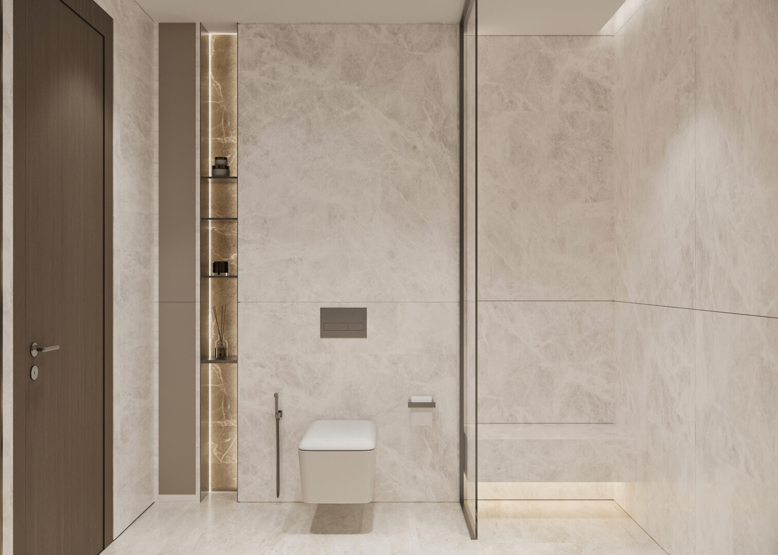 Die edlen Fliesen verleihen dem gesamten Raum einen eleganten Touch, während der Sunken Garden, ein innovatives Clima-Control-System, eine angenehme Wohlfühlatmosphäre schafft. Genießen Sie entspannende Duschen unter der Regendusche und stauen Sie Ihre Kleidung in den eingebauten Kleiderschränken.