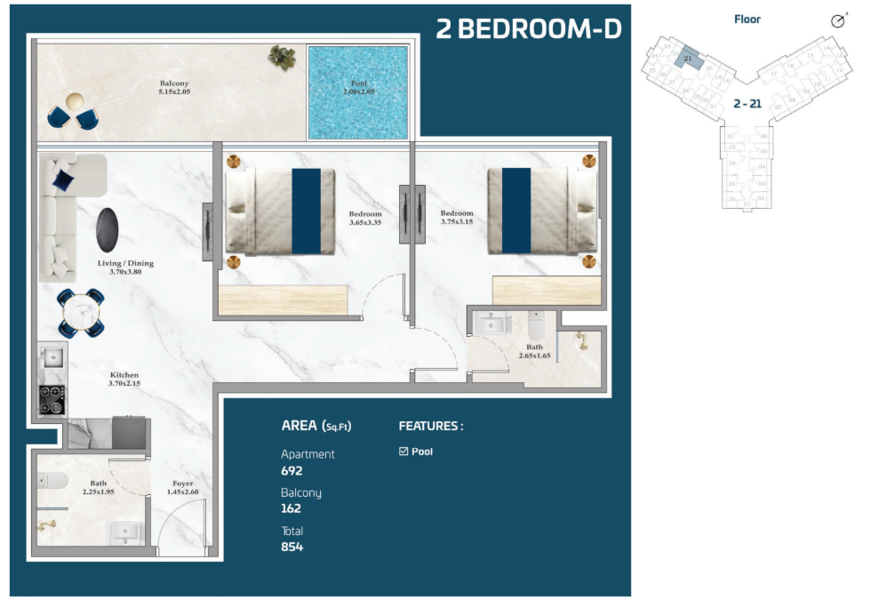 Willkommen in dieser atemberaubenden 2-Zimmer-Wohnung, die einen luxuriösen Lebensstil mit einer Reihe von außergewöhnlichen Annehmlichkeiten bietet.