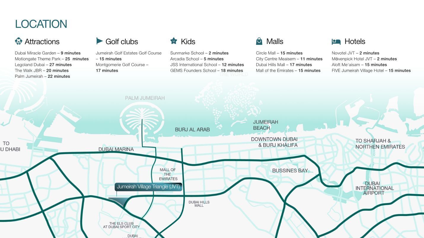 Dieses exklusive Anwesen befindet sich im begehrten Stadtteil Jumeirah Village Triangle (JVT) in Dubai, umgeben von einer familienfreundlichen Umgebung mit einer Mischung aus Villen und Apartments. Die grünen Oasen, Parks und Spielplätze schaffen eine entspannte Atmosphäre, ideal für Erholungssuchende und Naturliebhaber.