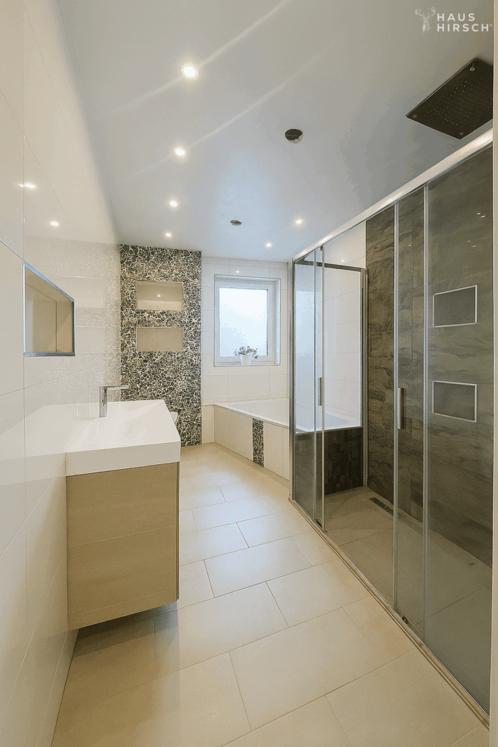 - Feinsteinzeug im Wohnbereich und Badezimmer