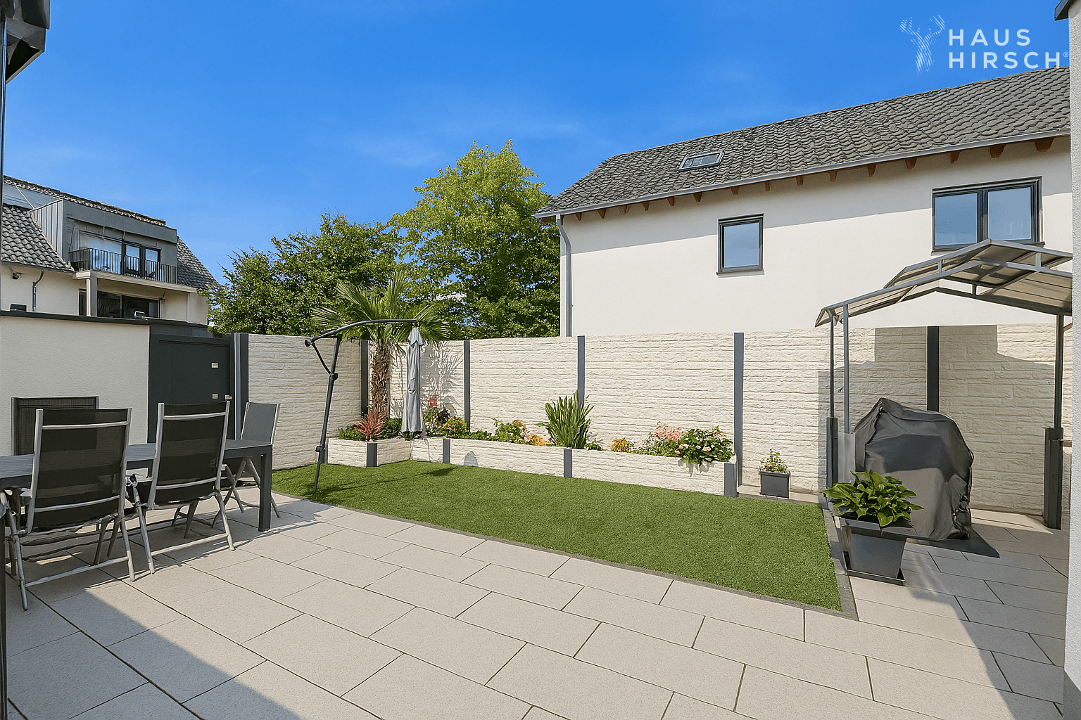 - Garten mit Süd-Ost-Ausrichtung und pflegeleichtem Kunstrasen
