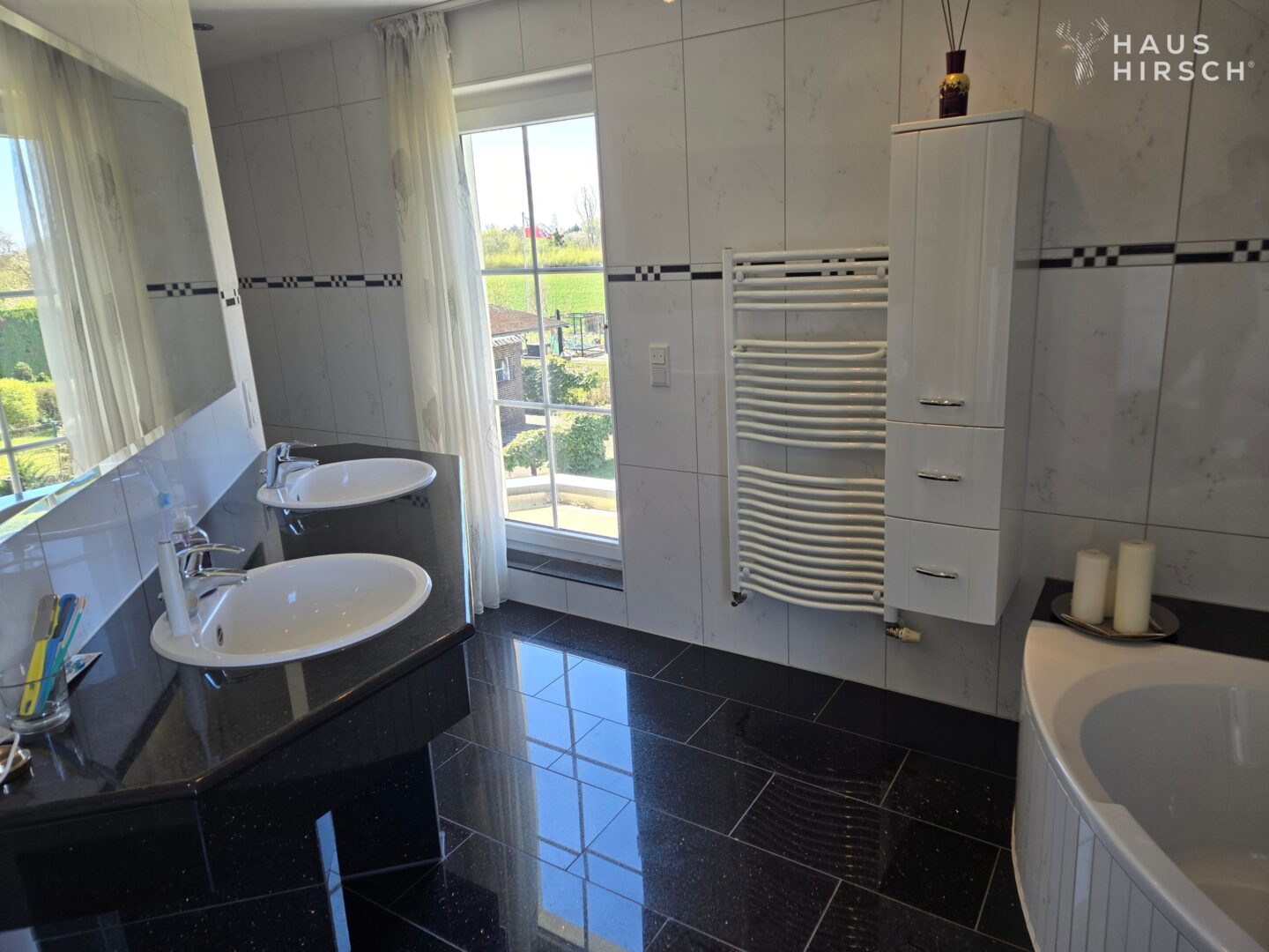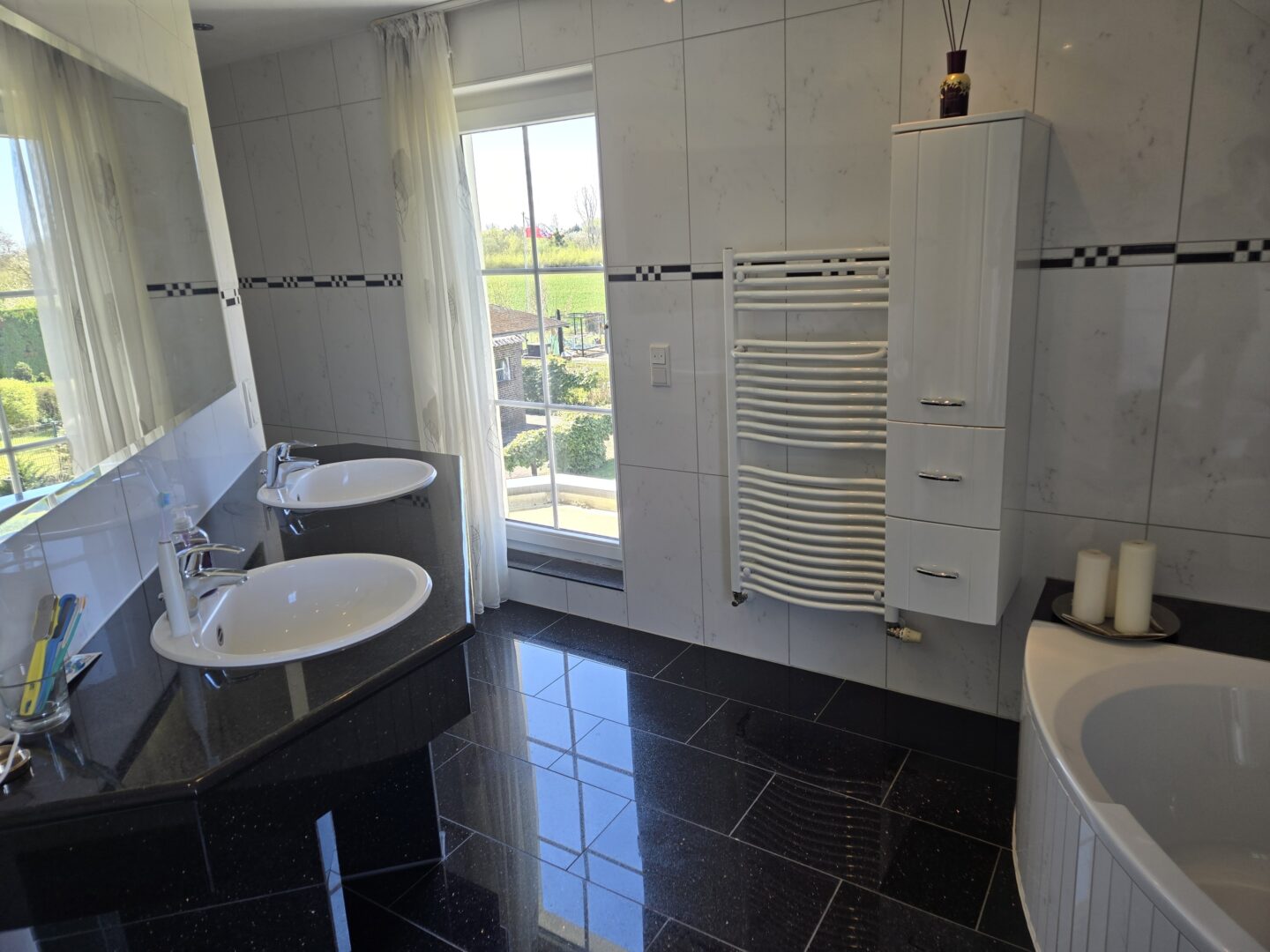 Hier erwarten Sie drei helle Schlafzimmer, ein begehbarer Kleiderschrank sowie ein luxuriös ausgestattetes Badezimmer. Der edle schwarze Granitboden verleiht dem Bad eine stilvolle Note, während die bodentiefe Regendusche und eine komfortable Eckbadewanne eine echte Wellnessoase schaffen. Ein besonderes Extra: der integrierte Wäscheaufzug, der praktischen Komfort bietet.