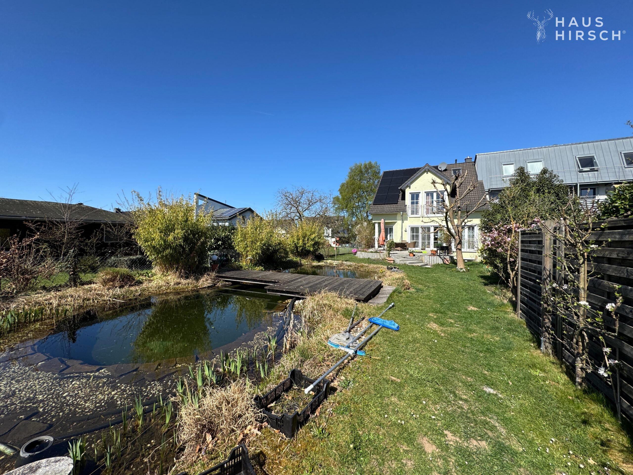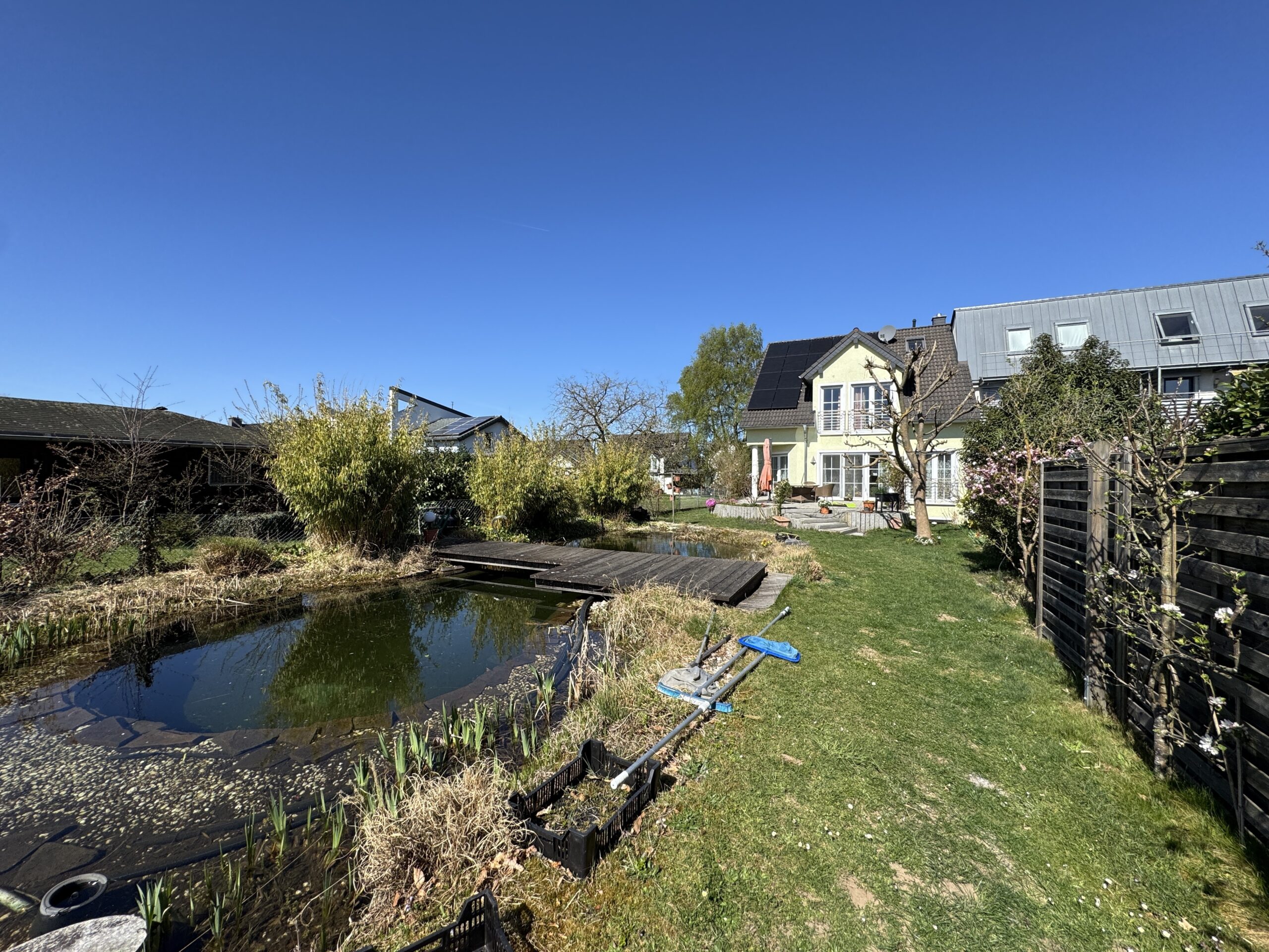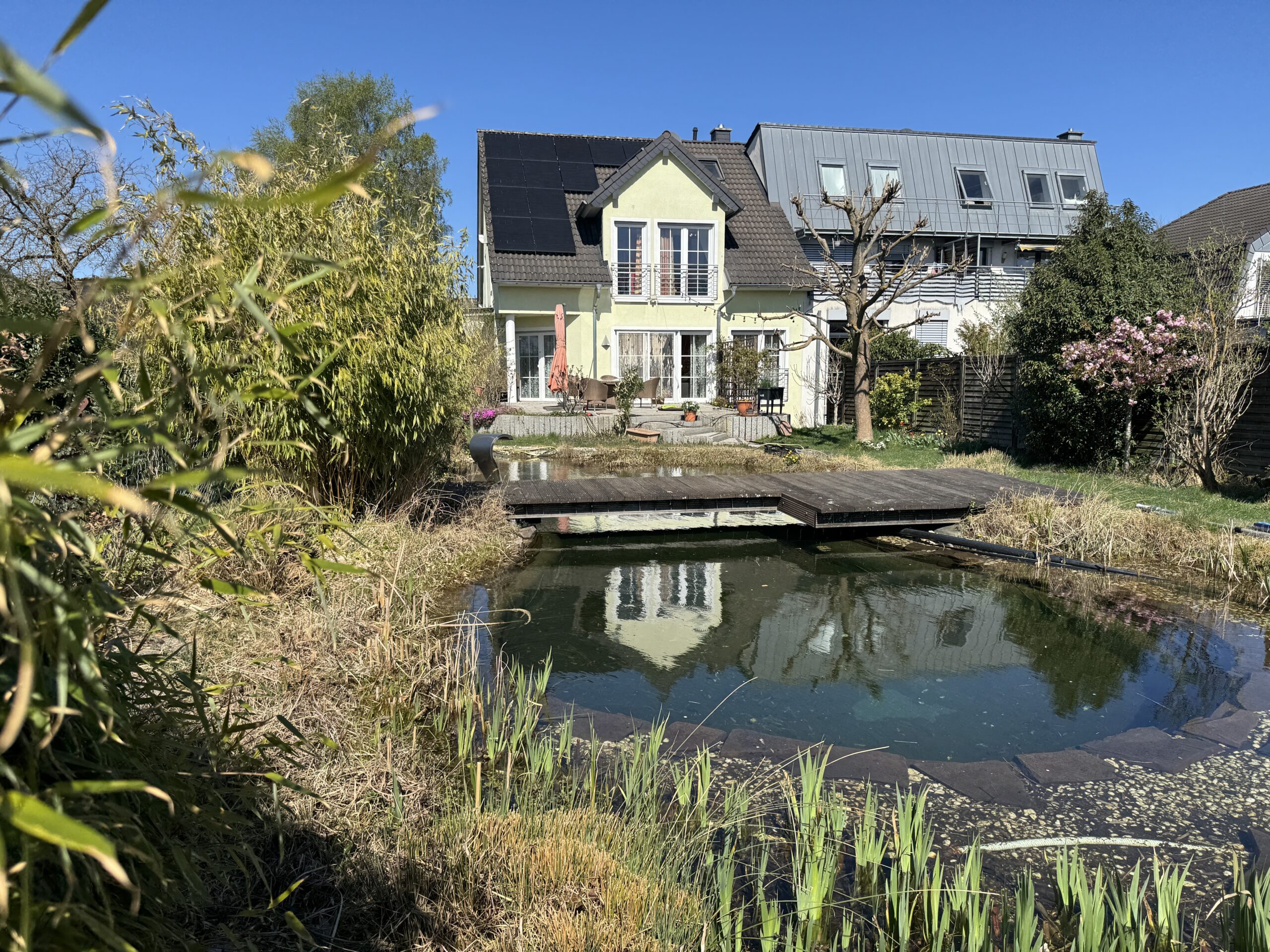 Das grüne Refugium wird durch einen natürlichen Schwimmteich mit außergewöhnlicher Bepflanzung und einem stilvollen Holzsteg harmonisch ergänzt – ein perfekter Ort zum Entspannen, Genießen und Träumen.