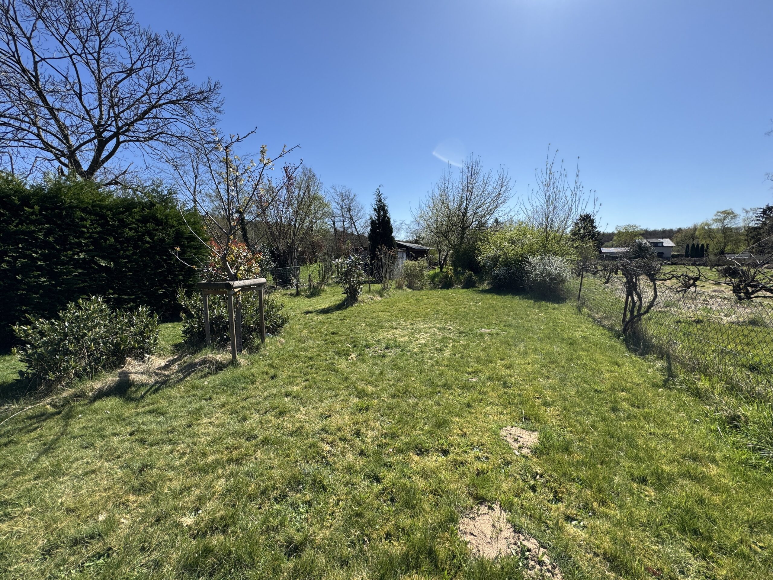 Vom Wohnbereich aus öffnet sich der Blick auf eine großzügige Sonnenterrasse und einen liebevoll gestalteten Garten.