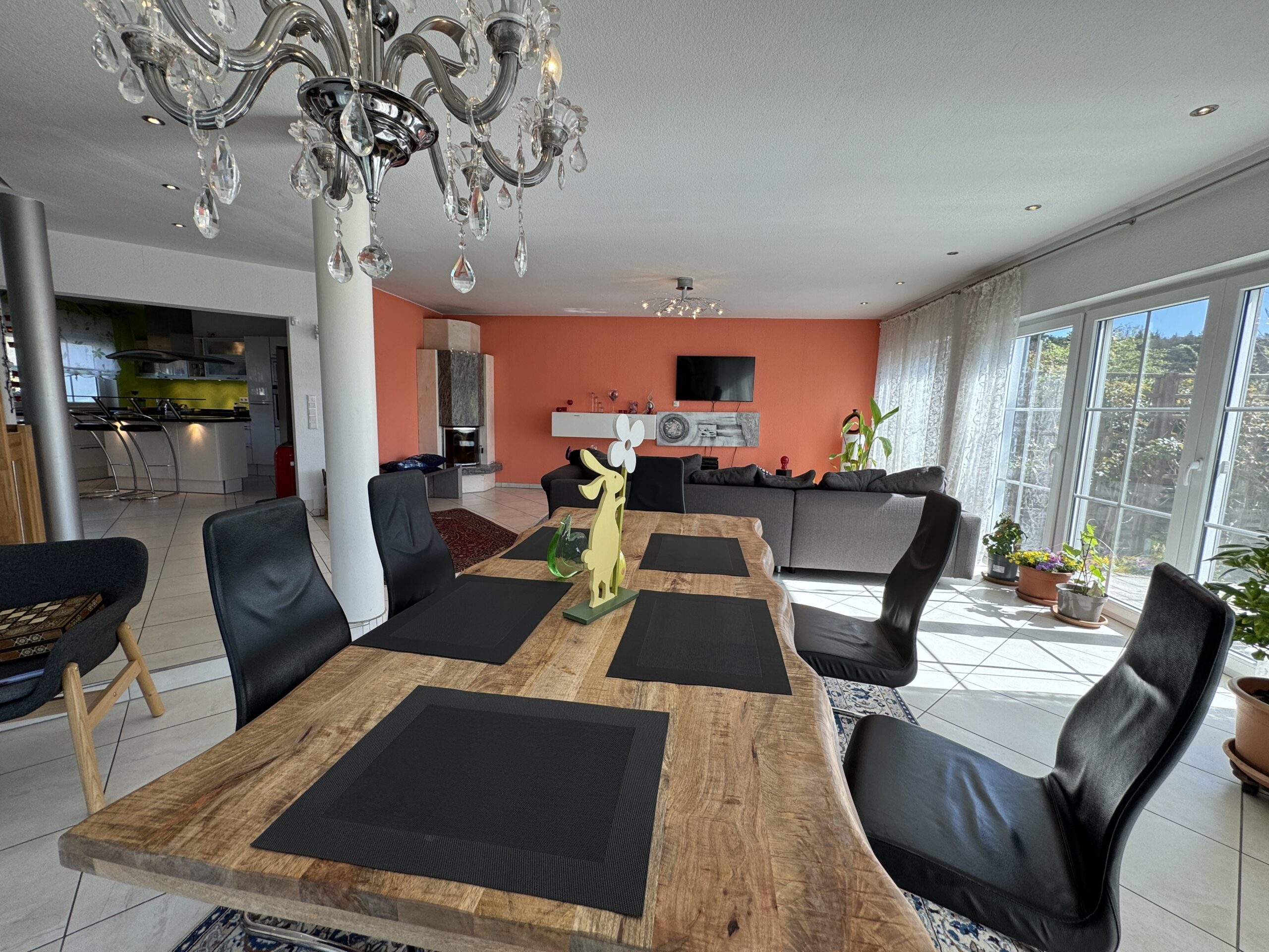 Die stilvoll integrierte, offene Küche bildet zusammen mit dem weitläufigen Wohn- und Essbereich das Herzstück des Hauses – ein Ort, an dem das Familienleben in seiner ganzen Lebendigkeit stattfindet. Für besondere Behaglichkeit sorgt der elegant mit Marmor verkleidete Kaminofen, der zu gemütlichen Stunden in wohliger Wärme einlädt.