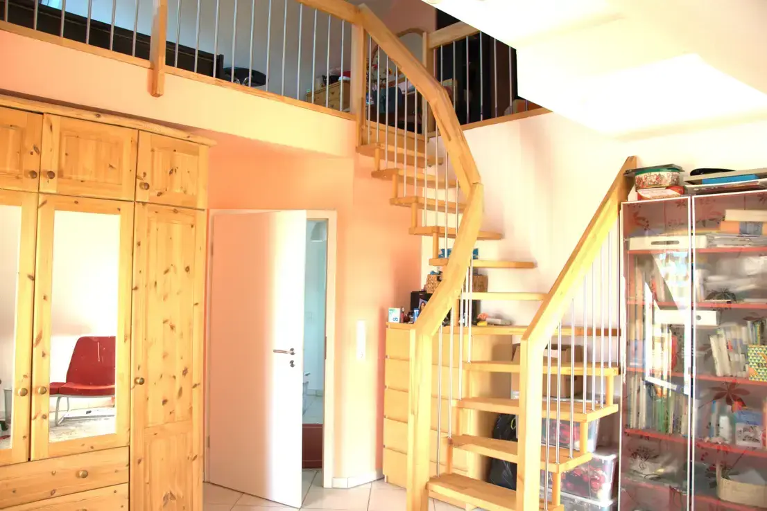 Eine offen gestaltete Holztreppe führt ins Obergeschoss, das durch eine großzügige Galerie im Spitzboden besticht.
