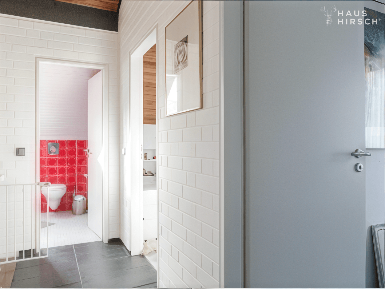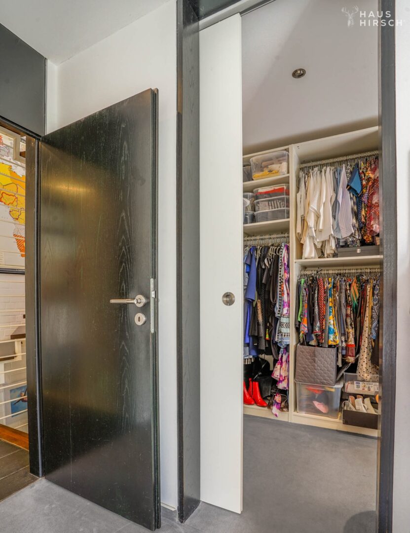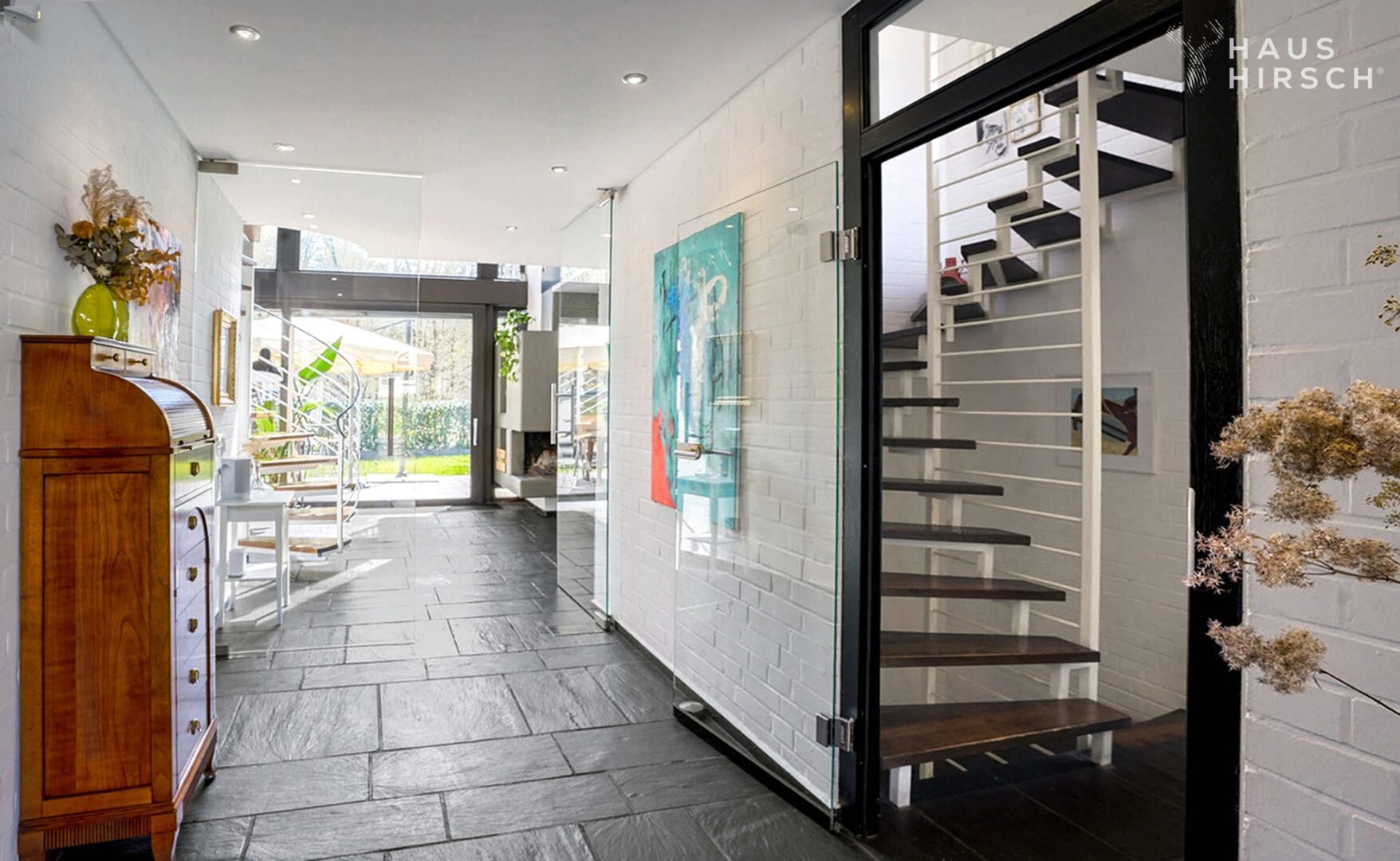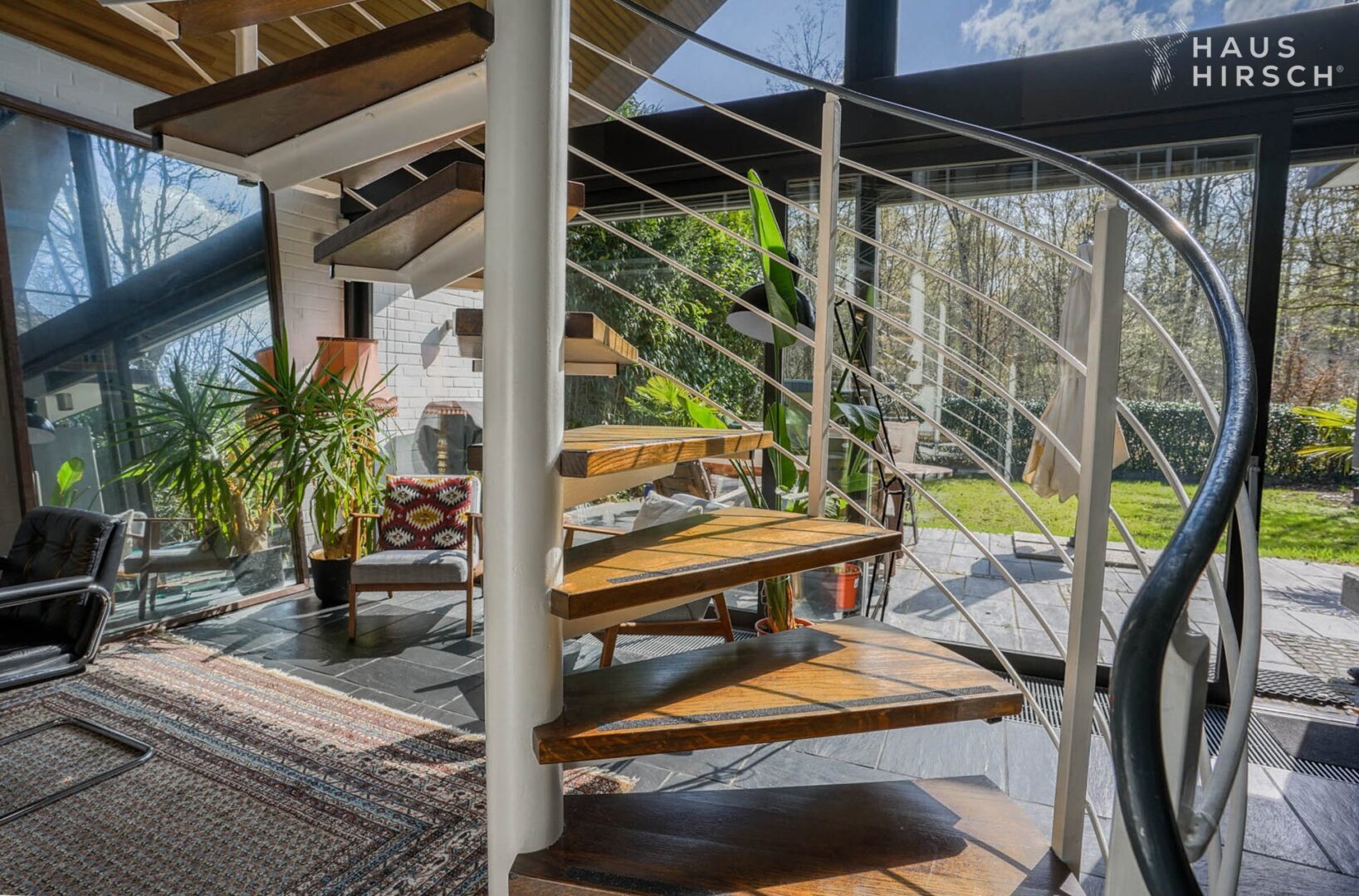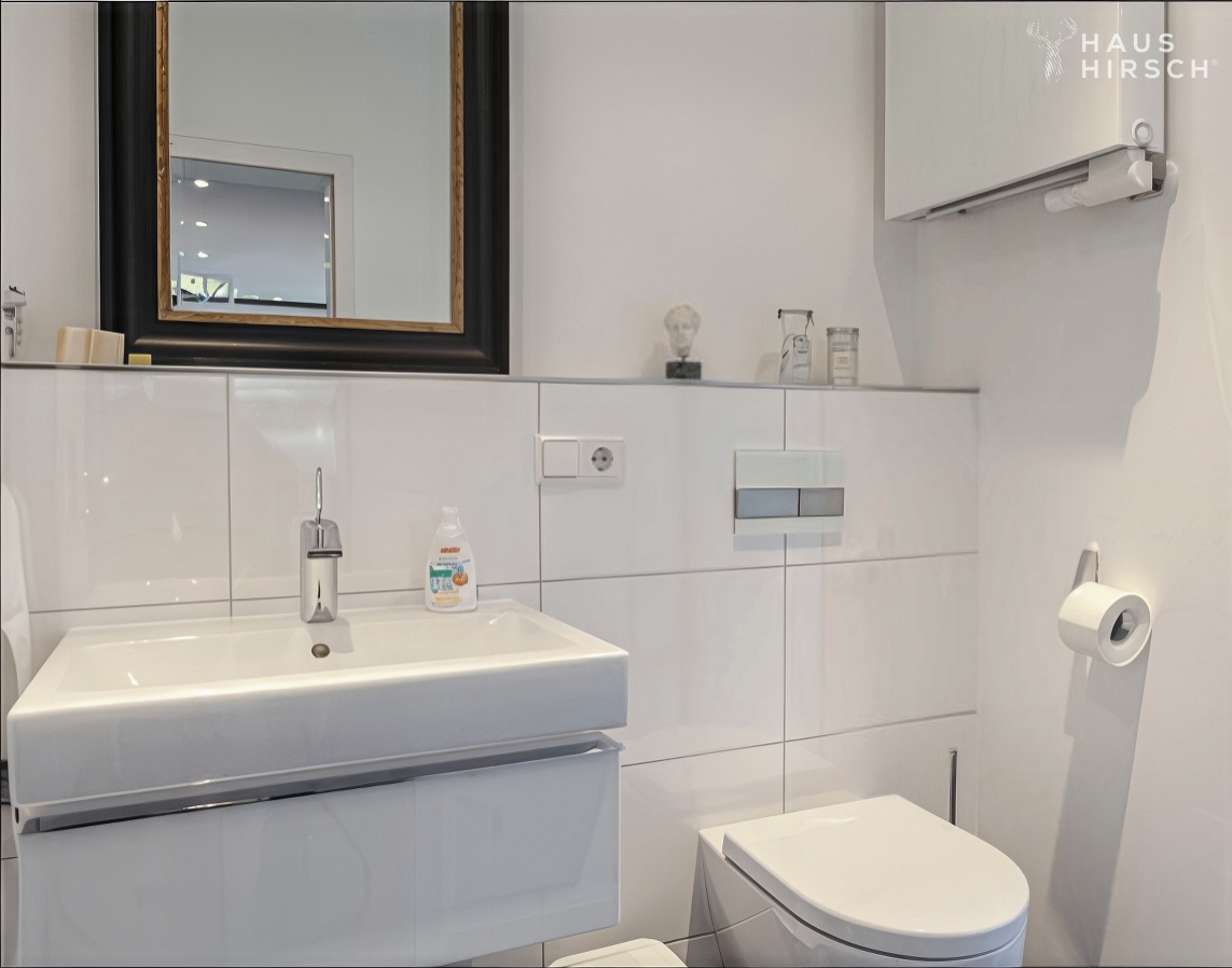 Ein Gäste-WC und ein Hauswirtschaftsraum im Erdgeschoss sowie ein separates Gäste- oder Bügelzimmer im Untergeschoss sorgen für zusätzlichen Wohnkomfort. Zwei Treppen, eine stilvolle Wendeltreppe im Wohnbereich und ein großzügiges Haupttreppenhaus im rückwärtigen Bereich, verbinden die Etagen.