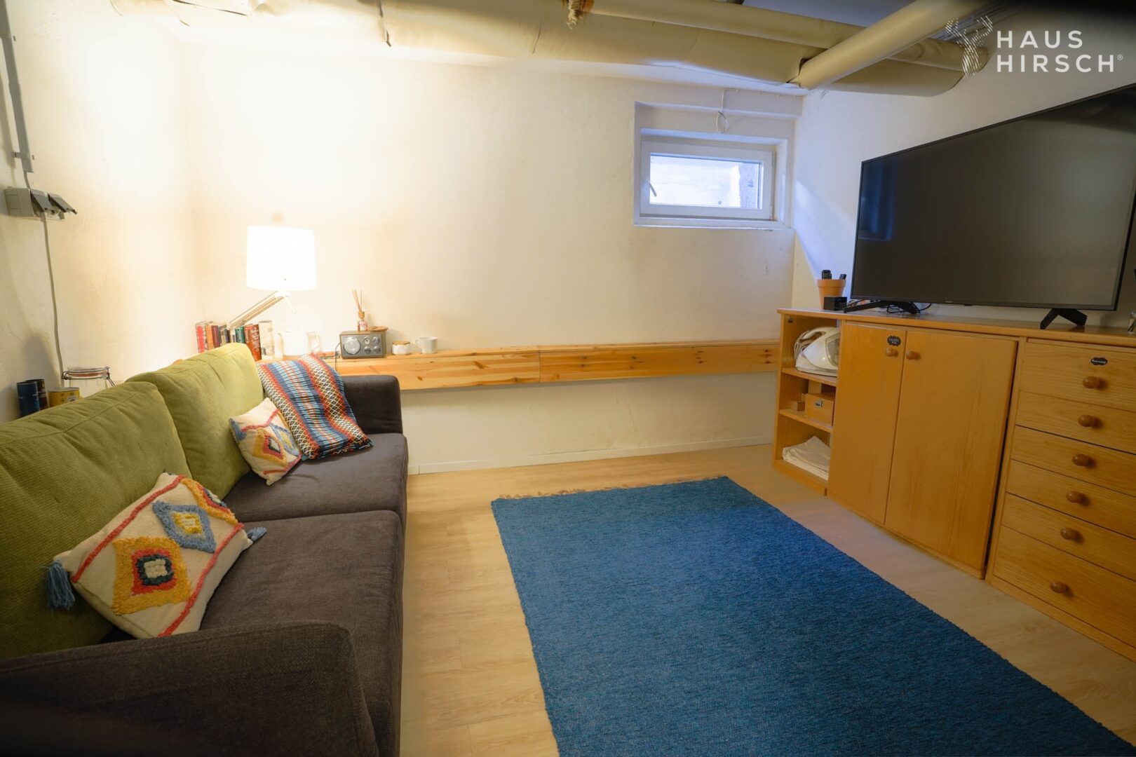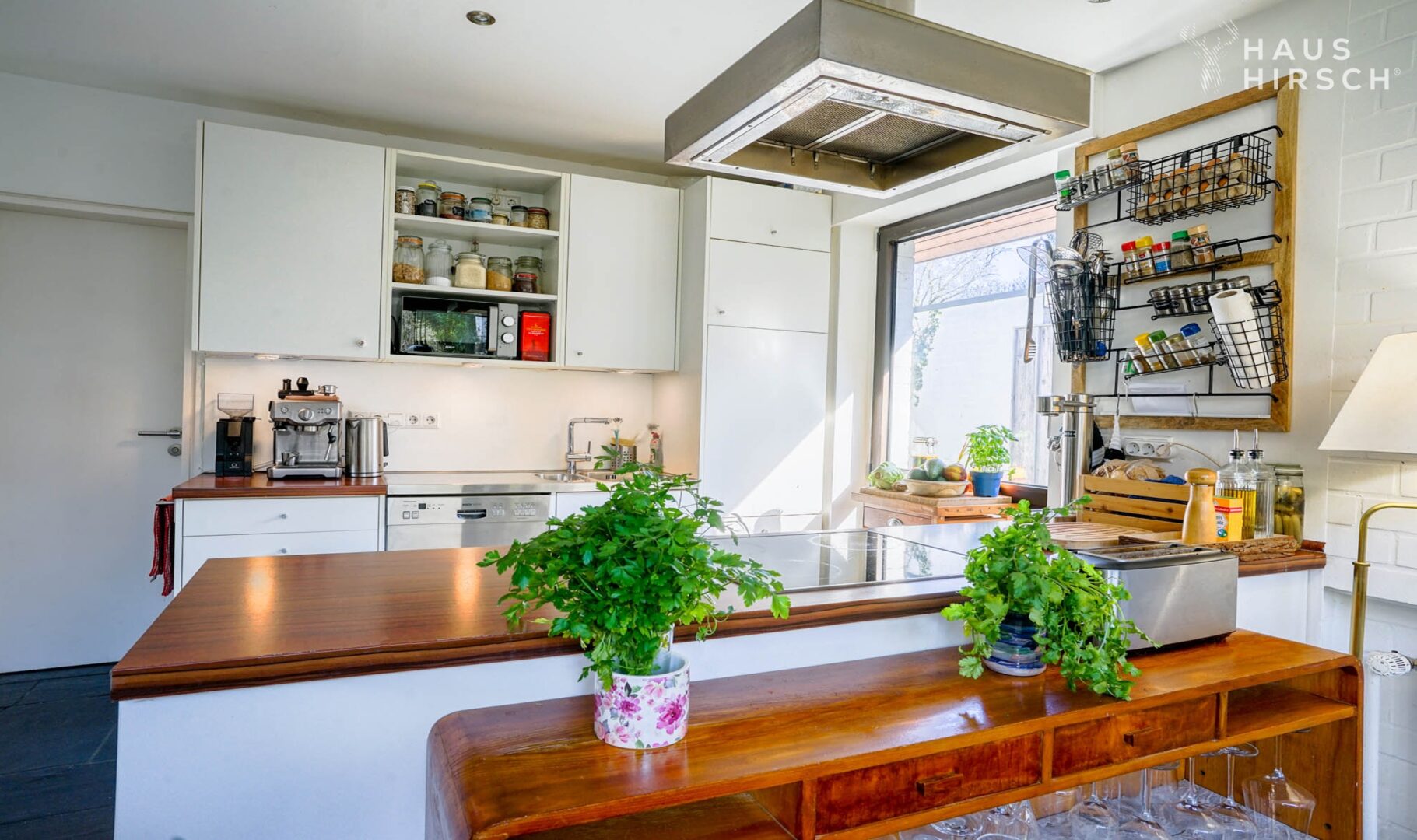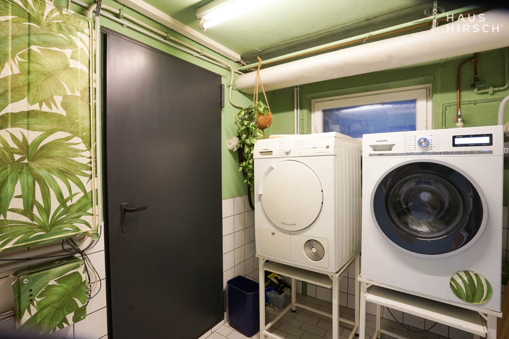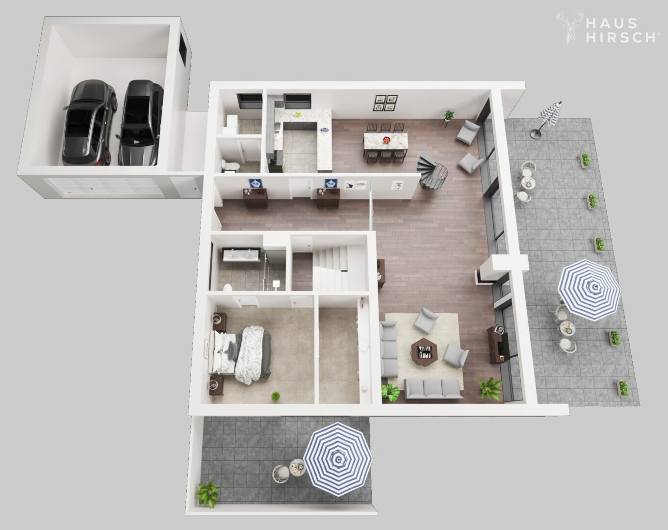Ein Gäste-WC und ein Hauswirtschaftsraum im Erdgeschoss sowie ein separates Gäste- oder Bügelzimmer im Untergeschoss sorgen für zusätzlichen Wohnkomfort. Zwei Treppen, eine stilvolle Wendeltreppe im Wohnbereich und ein großzügiges Haupttreppenhaus im rückwärtigen Bereich, verbinden die Etagen.