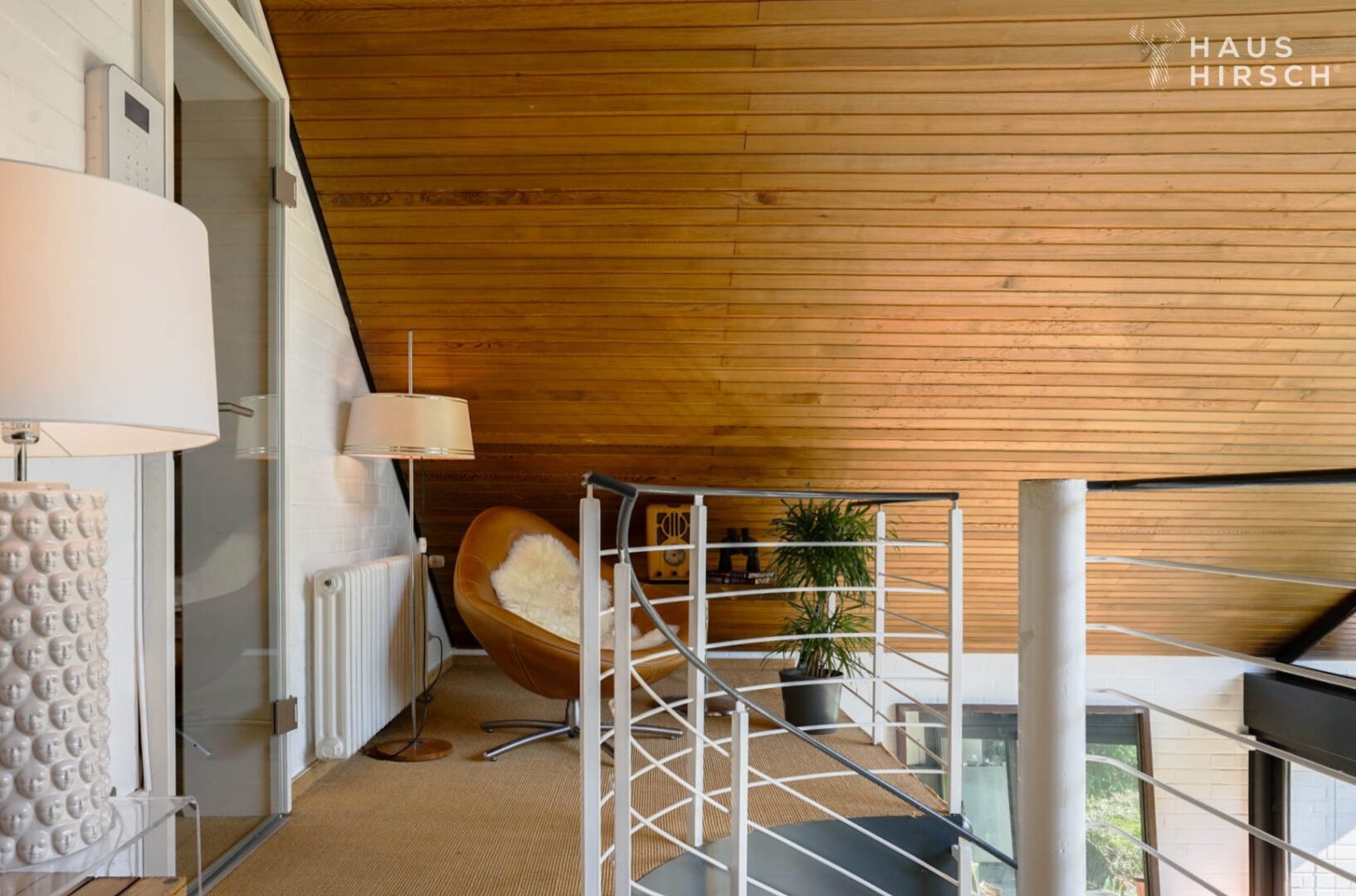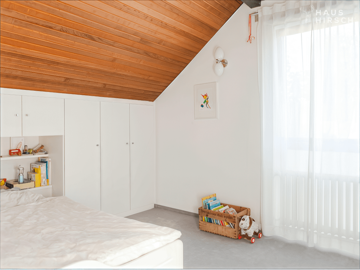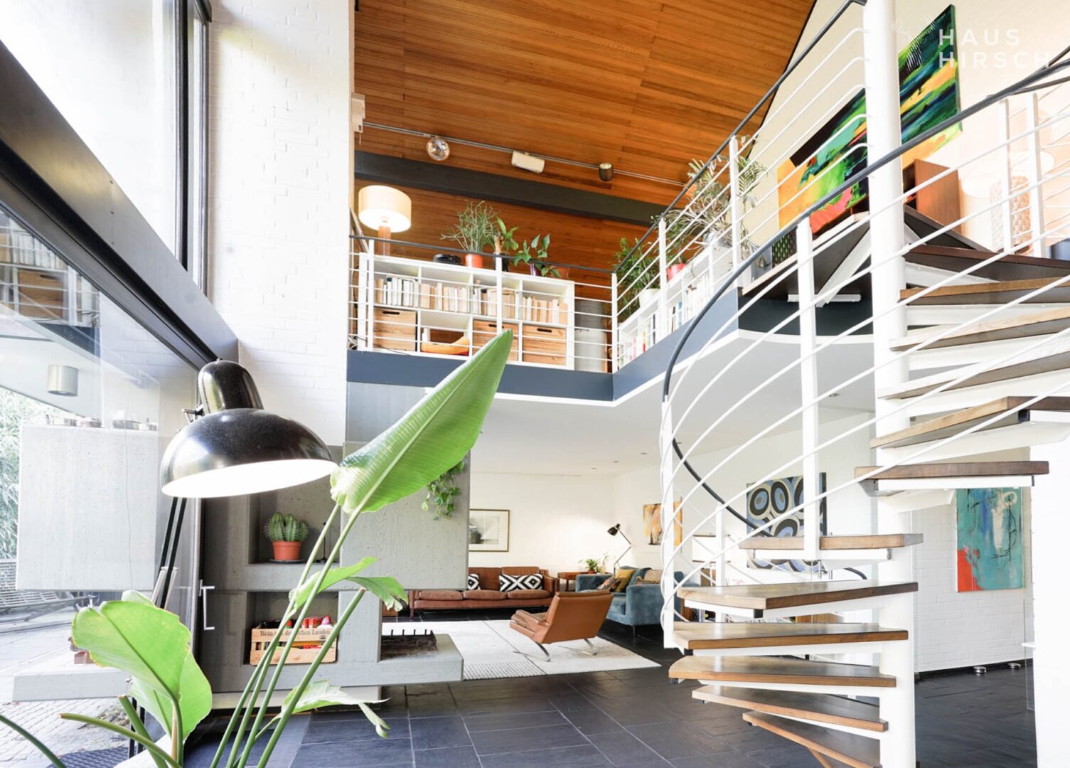 Die Galerie im Obergeschoss beeindruckt mit einer Leseecke, einem zweiten Wohnzimmer, einem Büro und einem Balkon mit herrlicher Aussicht. Zwei Schlafzimmer mit über 4 m Deckenhöhe sowie ein Büro befinden sich ebenfalls im OG.