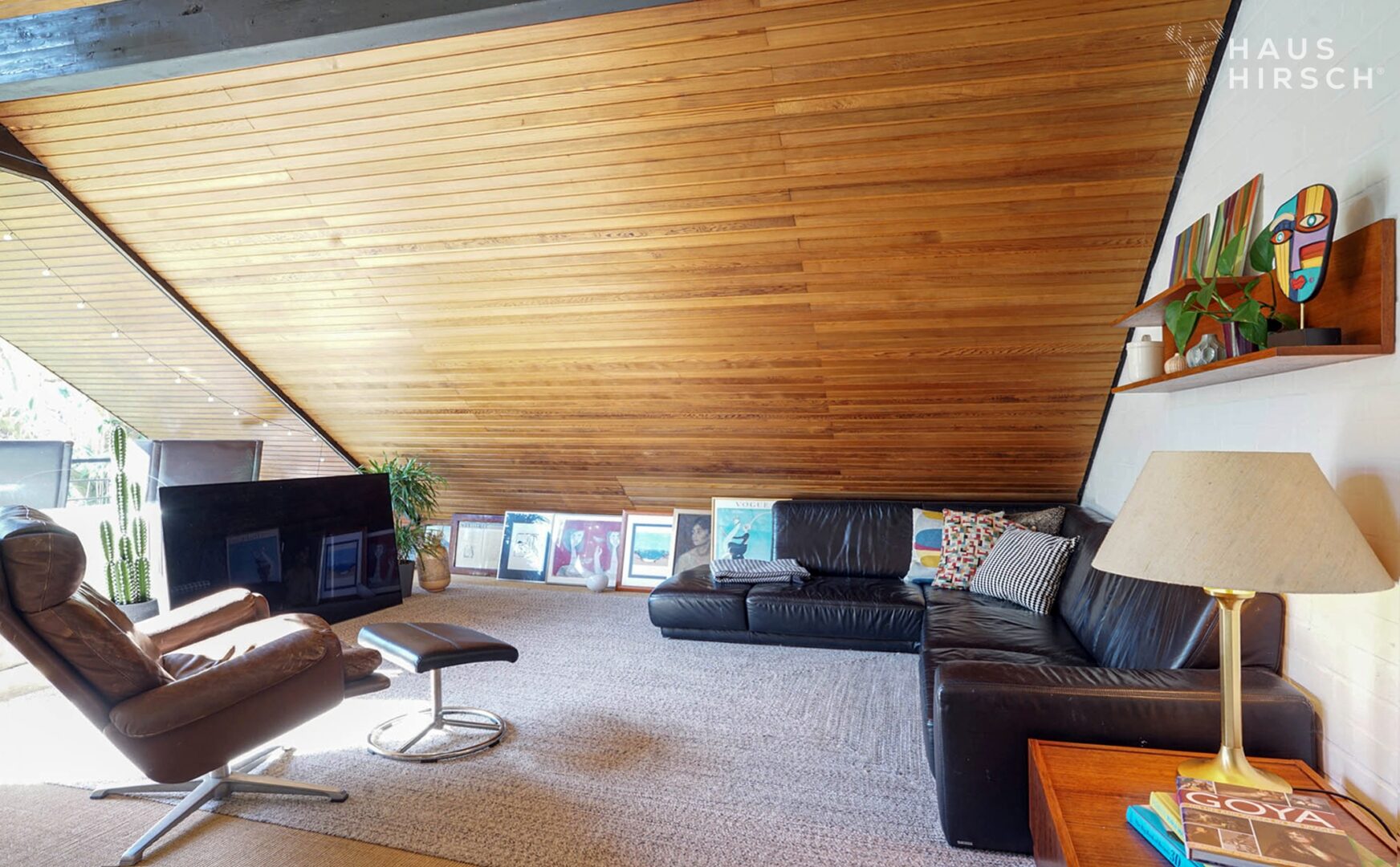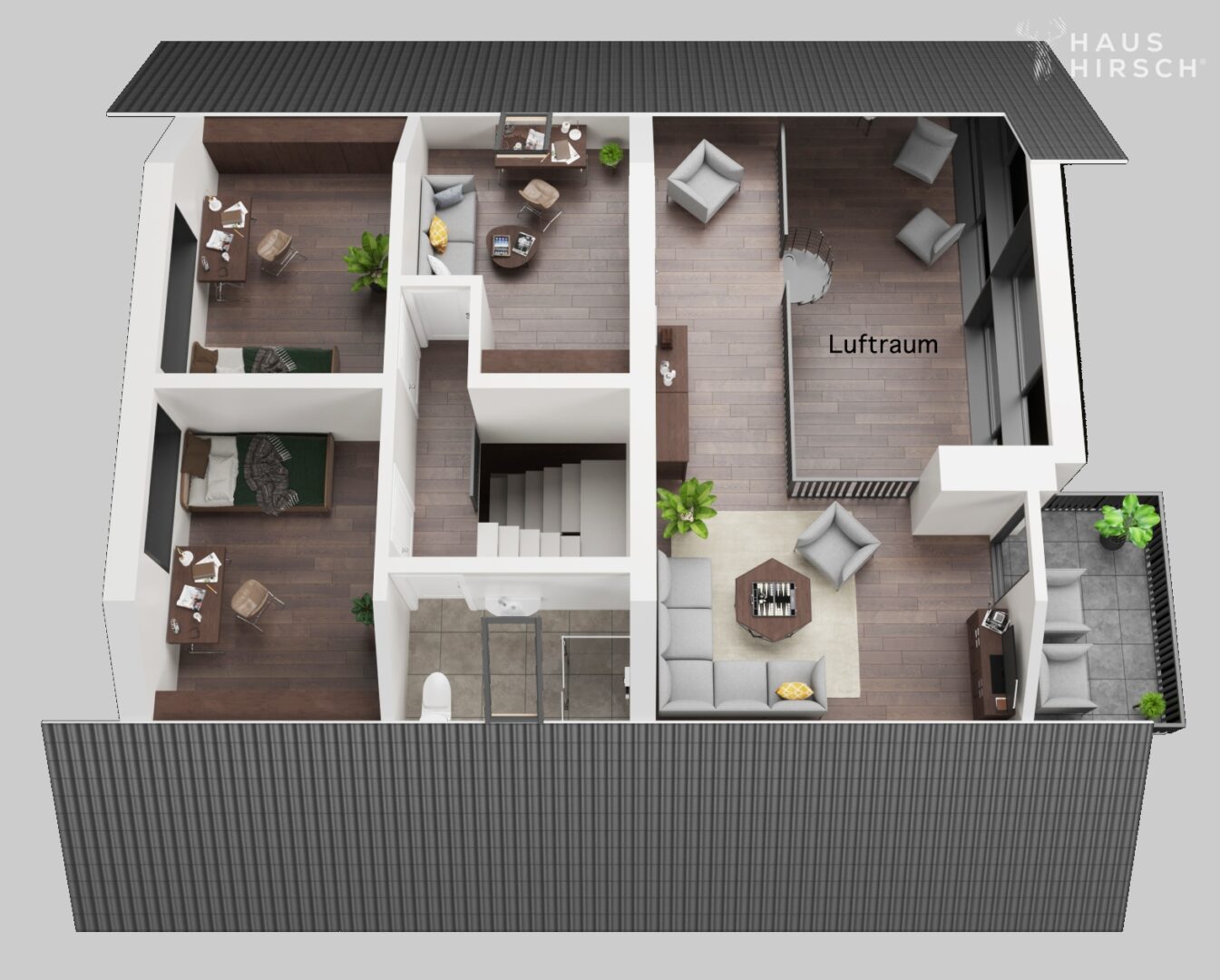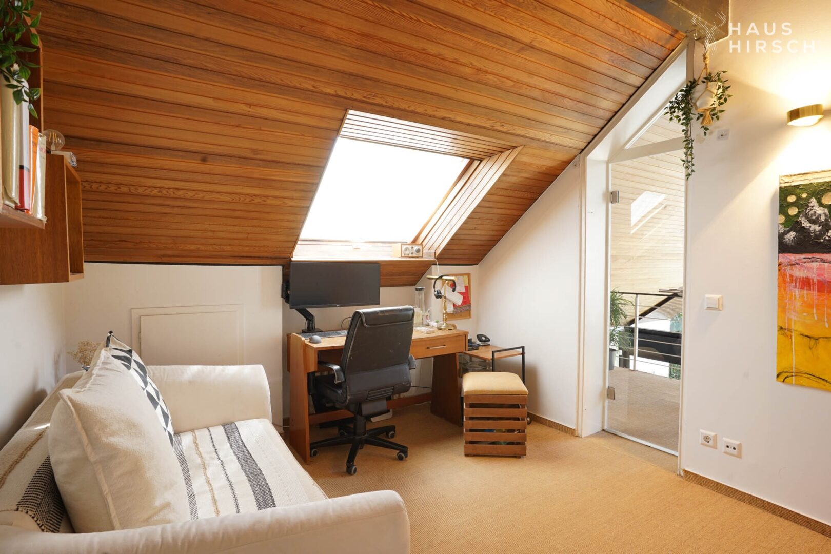 Die Galerie im Obergeschoss beeindruckt mit einer Leseecke, einem zweiten Wohnzimmer, einem Büro und einem Balkon mit herrlicher Aussicht. Zwei Schlafzimmer mit über 4 m Deckenhöhe sowie ein Büro befinden sich ebenfalls im OG.