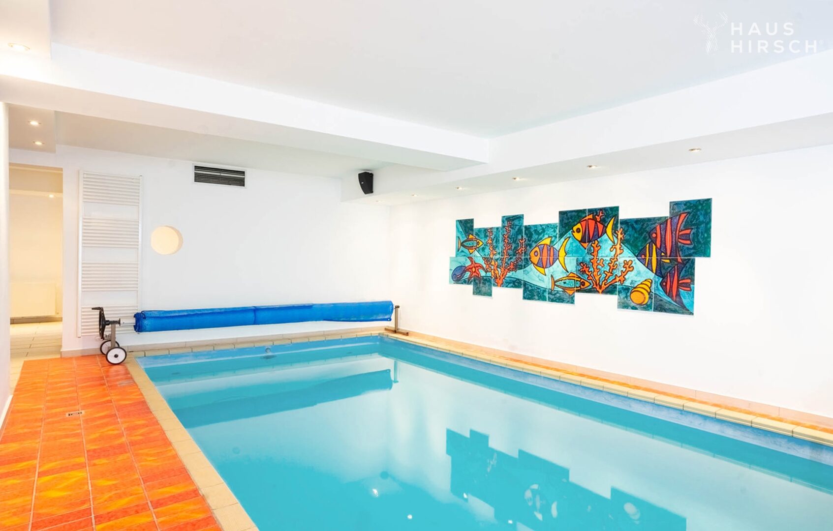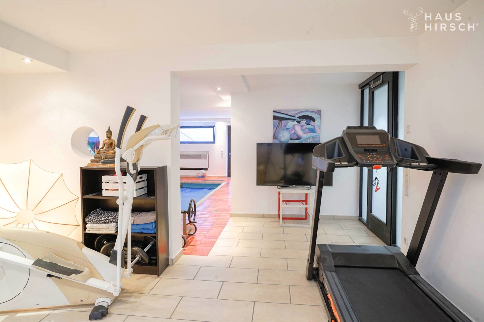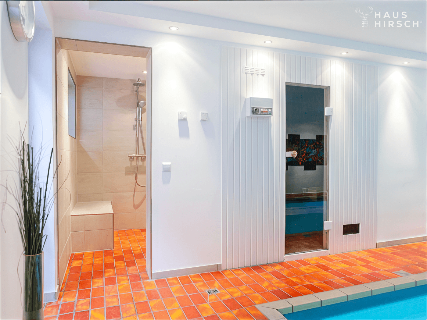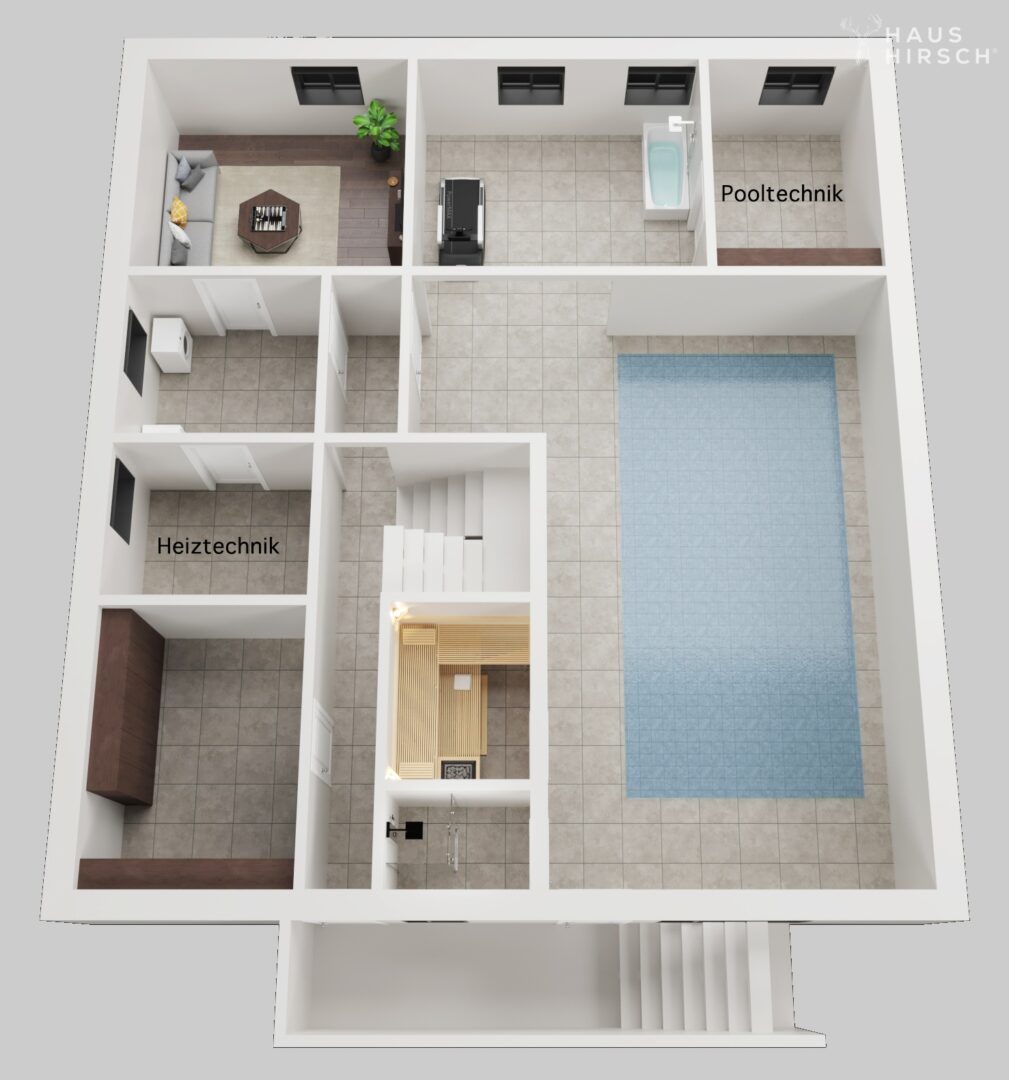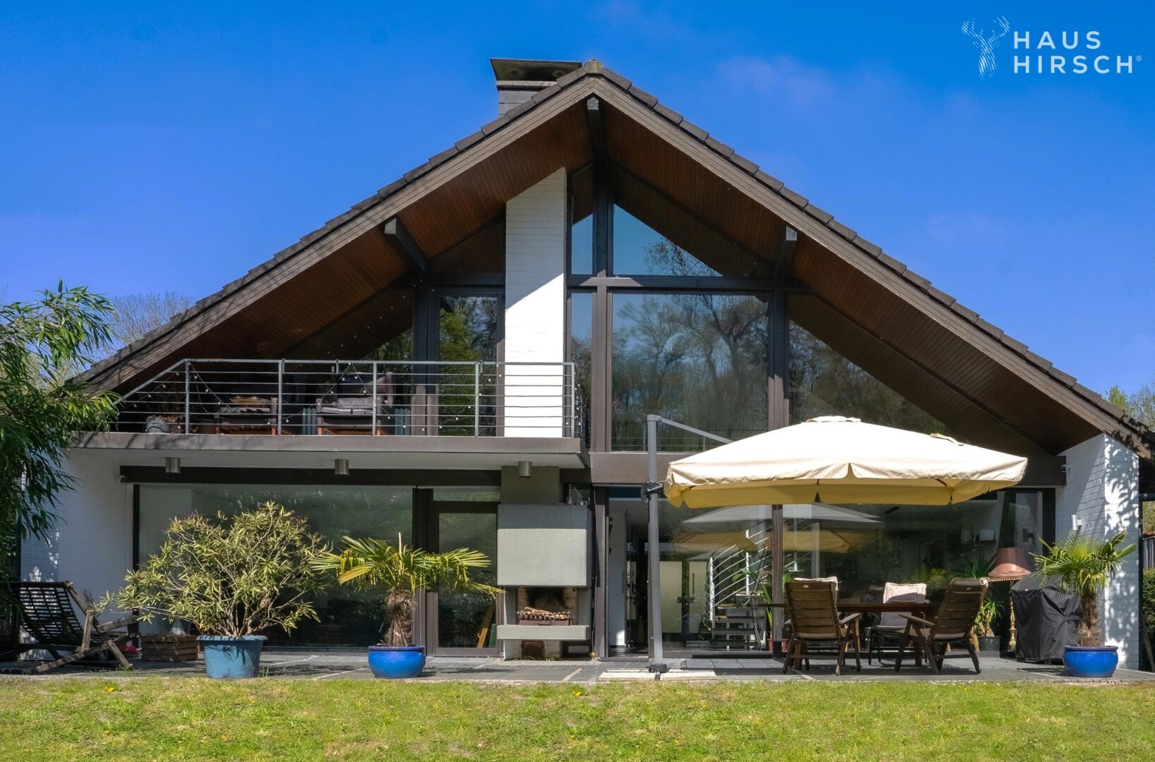 Das 707m² große Grundstück in Südausrichtung verfügt über eine 40m² große Terrasse, die zur Hälfte überdacht ist und einen Außenkamin für gesellige Abende im Freien bietet. Im Untergeschoss lädt der Wellnessbereich zum Entspannen ein: Ein beheiztes Schwimmbecken, eine XL-Badewanne, Sauna, Dusche und Platz für Fitnessgeräte stehen Ihnen hier zur Verfügung.