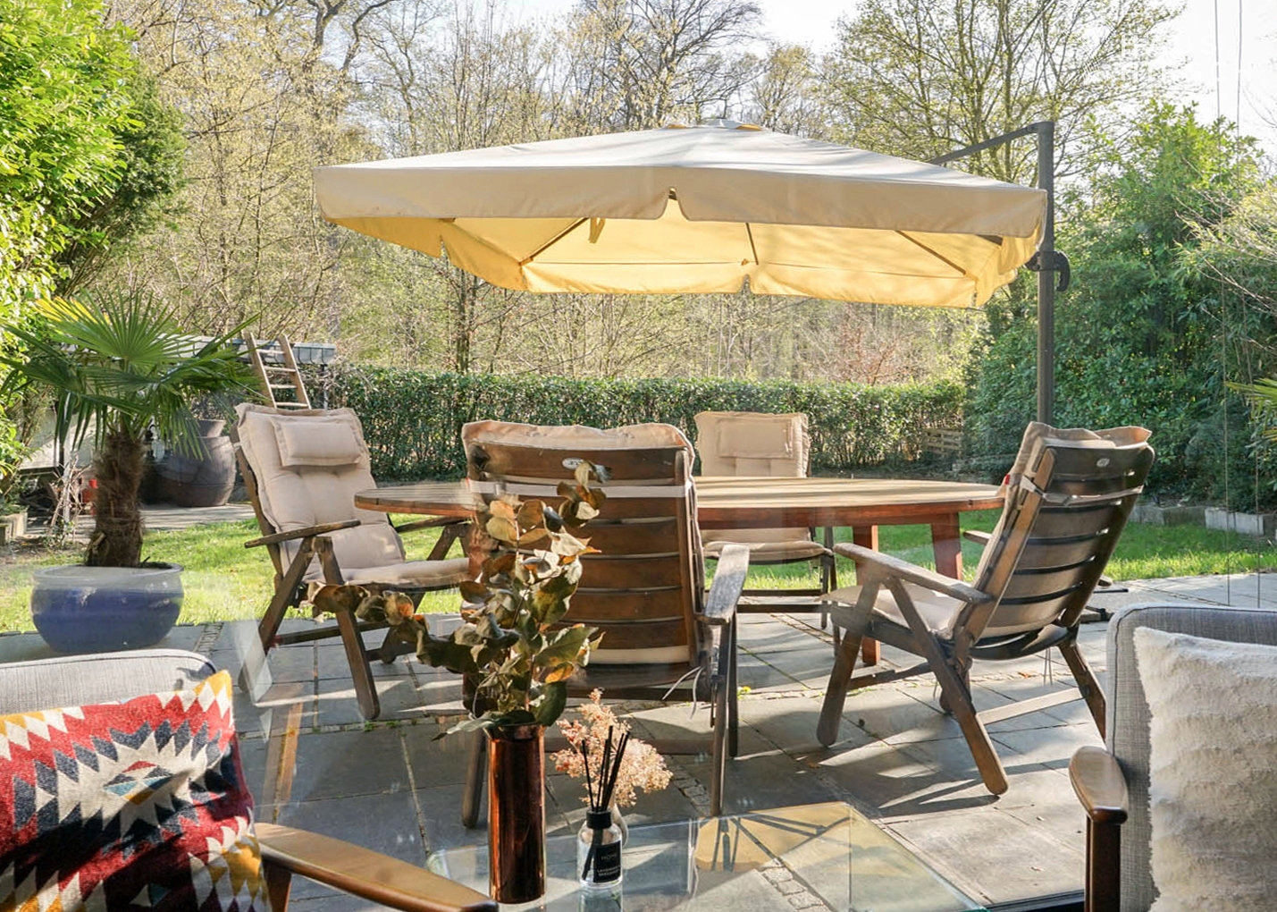 Genießen Sie maximale Lichtausbeute im Winter durch die großen Glasflächen und fühlen Sie sich dank des alten Baumbestands, der das Grundstück umgibt, naturnah und privat. Willkommen in Ihrem neuen Zuhause!