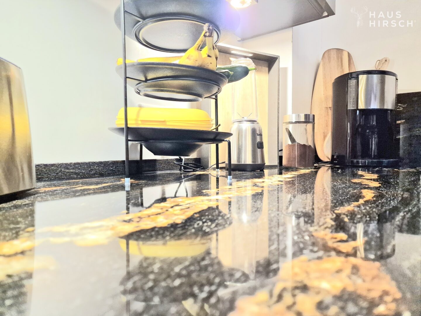 Beim Betreten des Hauses empfängt Sie eine großzügige Diele, die mit edlen Bodenfliesen des Typs Mirage (Format 60 x 60) gestaltet ist und sofort den Eindruck eines hochwertigen und durchgängigen Wohnkonzepts vermittelt. Von hier aus gelangen Sie unmittelbar in die individuell angefertigte Küche – ein echtes Unikat handwerklicher Präzision. Die 3 cm starke Granitarbeitsplatte bildet das Herzstück, während Wände und Decke mit feinem Marmorino-Spachtel veredelt wurden. Ergänzt durch den gleichen Bodenbelag wie in der Diele entfaltet der Raum einen mediterranen Charme, der eine warme und zugleich elegante Atmosphäre schafft.