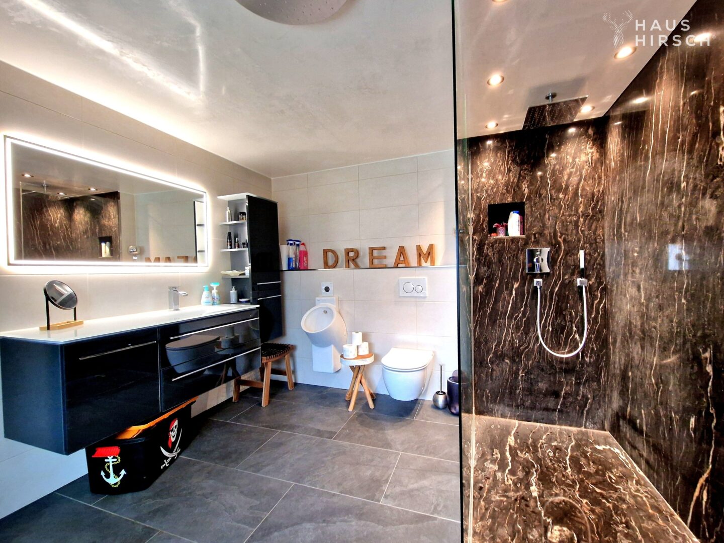Über eine Holztreppe gelangen Sie ins Obergeschoss. Dort erwartet Sie neben einer weiteren Diele, die derzeit als Büro genutzt wird, ein großzügiges Badezimmer. Komplett gefliest und mit exklusiven Materialien ausgestattet, bietet es höchsten Komfort: eine bodengleiche Dusche mit Naturstein Nero Viktoria, ein Urinal, ein Wand-WC sowie ein Glaswaschtisch mit LED-beleuchtetem Spiegel. Helle Bodenfliesen im Format 90 x 45 und eine mit Marmorino-Spachtel veredelte Decke verstärken den luxuriösen Gesamteindruck.