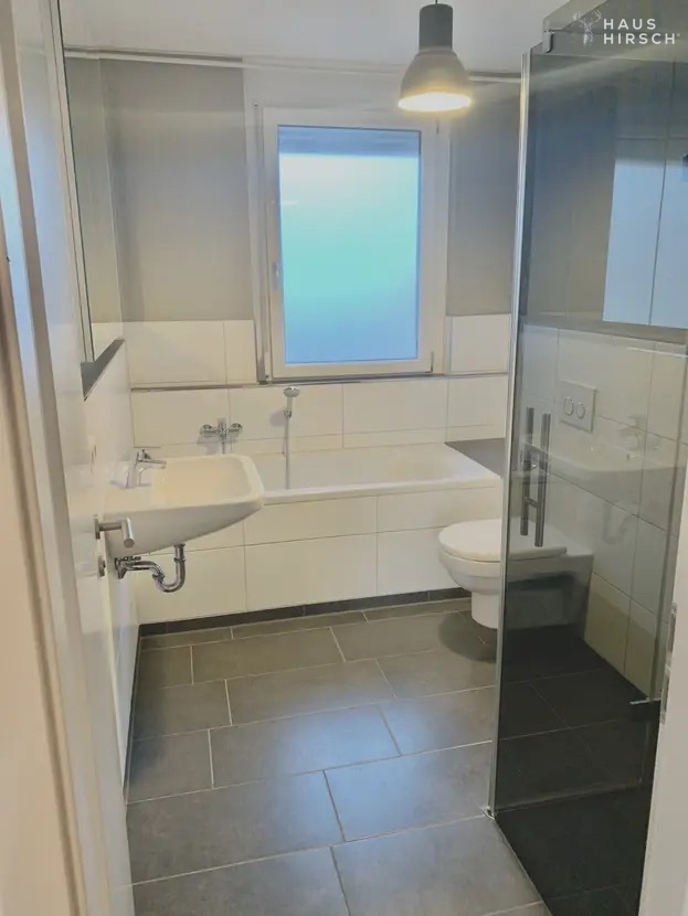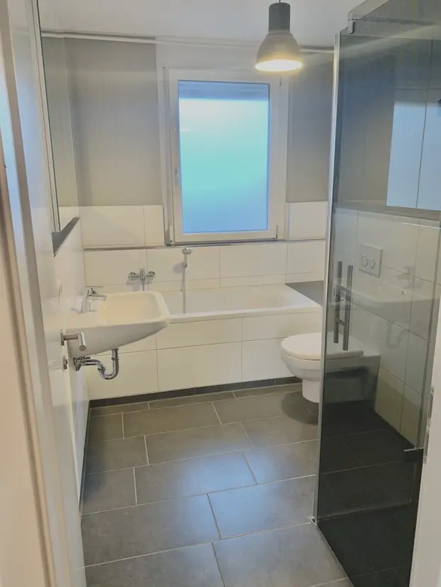 Im Obergeschoss erwarten Sie 2,5 Schlafzimmer mit Parkettboden und modernem Tageslichtbad, das mit hochwertigen Steinfliesen, einer ebenerdigen Dusche und einer Badewanne ausgestattet ist. Dieses Stockwerk bietet genügend Platz für Entspannung und Erholung.