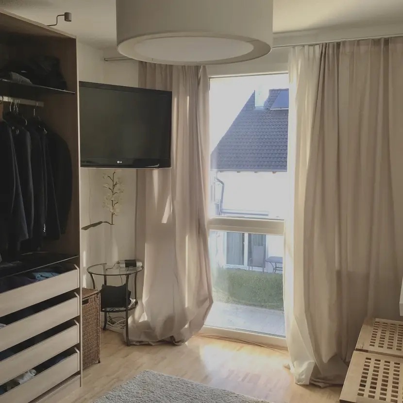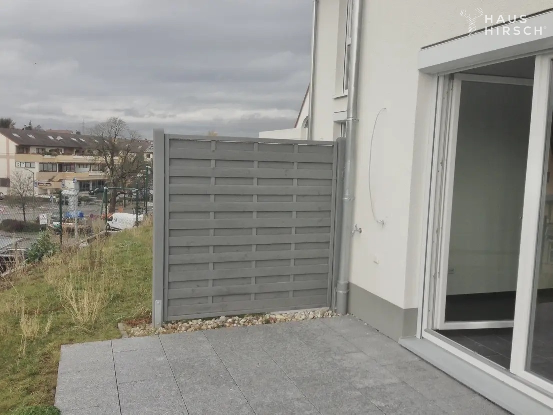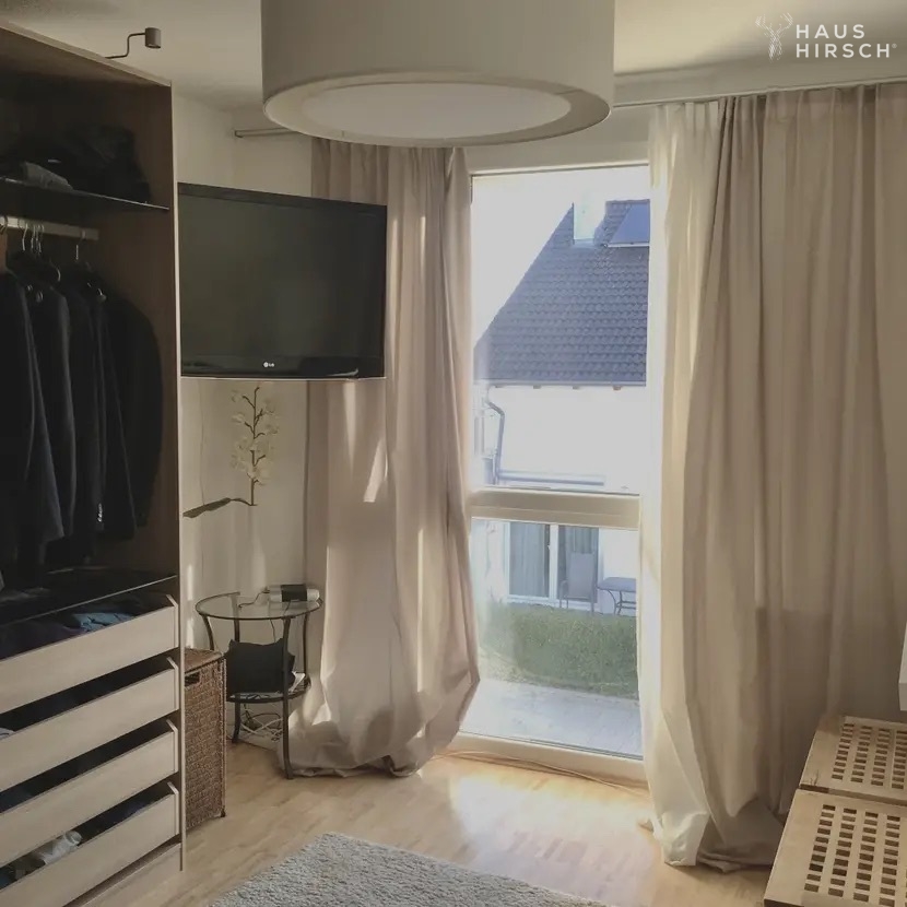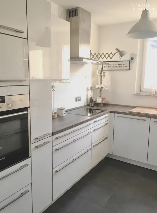 Betritt man das Erdgeschoss, eröffnet sich einem ein offener Wohn- und Essbereich mit hochwertigen Steinfliesen, die eine warme Atmosphäre schaffen. Die angrenzende hochwertige Einbauküche mit Geräten der Marke Siemens lädt zum Kochen und Verweilen ein. Von hier aus gelangt man auch direkt auf die Terrasse, wo man den unverbaubaren Blick in Südwest-Richtung genießen kann. Ein Gäste-WC und der Eingangsbereich mit Garderobe runden das Erdgeschoss ab.