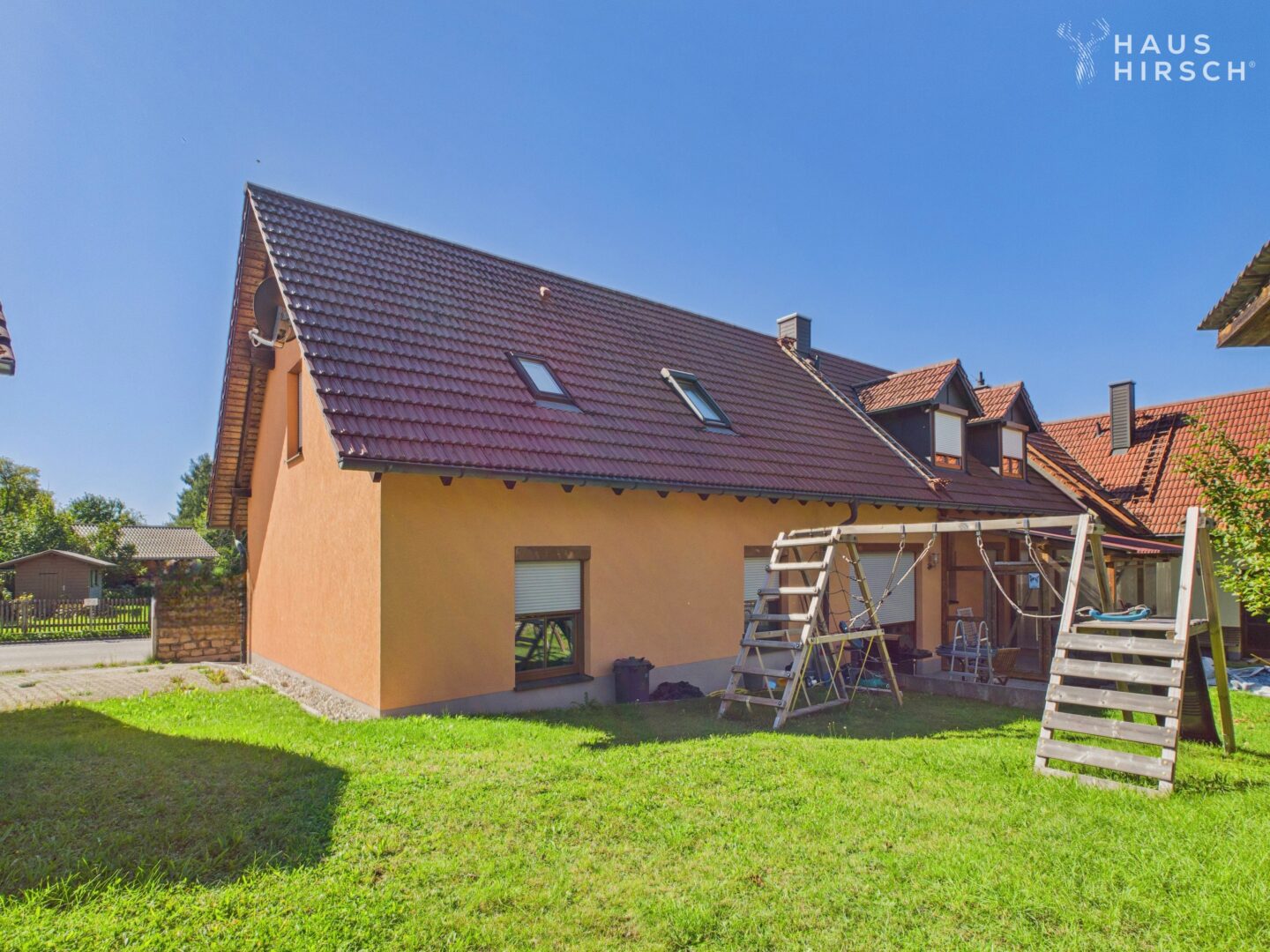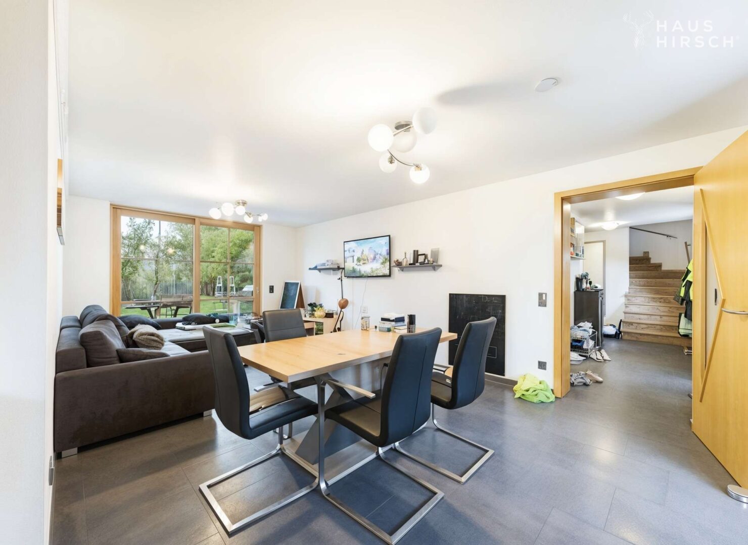Vom offenen Wohnbereich aus führen bodentiefe Fenster direkt auf die Terrasse und in den weitläufigen rund 300 m² großen Garten, der mit seinem gepflegten Grün und dem Blick ins Freie pure Erholung bietet. Hier genießen Sie Sonne, Ruhe und viel Platz zum Spielen, Entspannen oder Feiern.