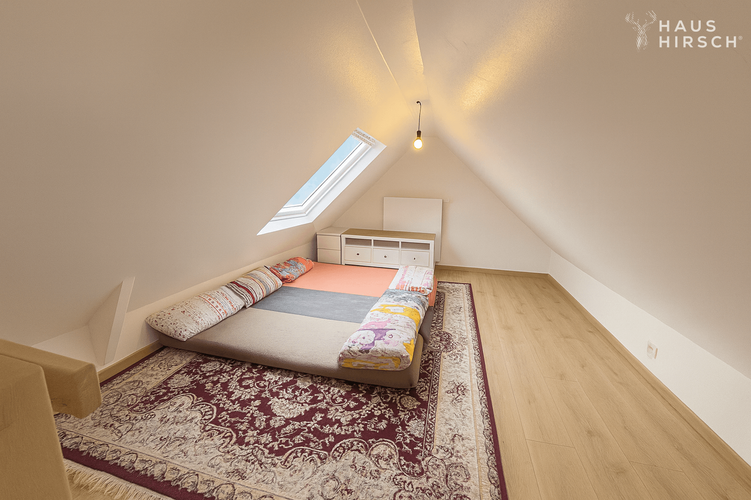 Das Obergeschoss umfasst insgesamt zwei Schlaf- und ein Badezimmer. Das Dachgeschoss wurde wohnlich ausgebaut und wird aktuell als zusätzliches Schlafzimmer genutzt.