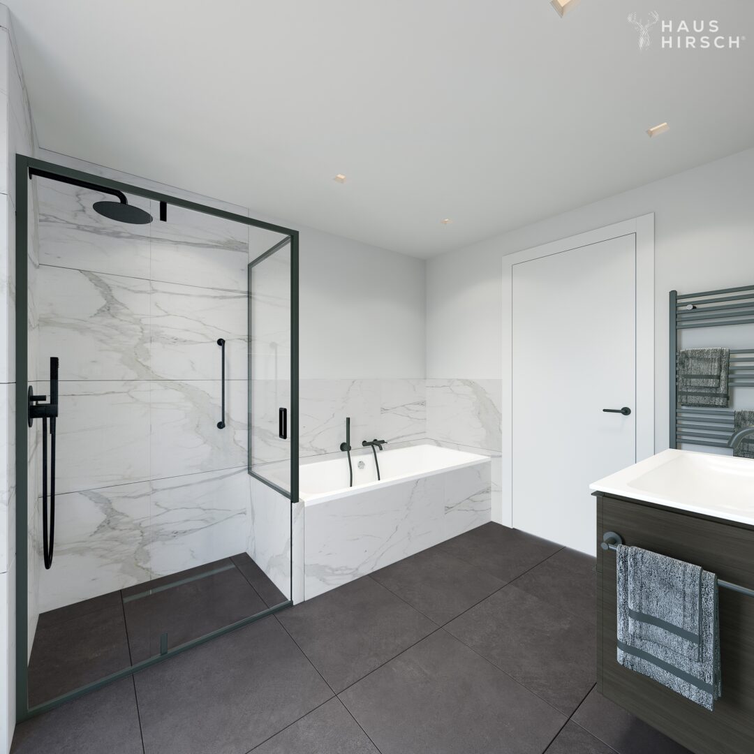 Die Bäder sind natürlich hochwertig gefliest. Auf die Materialien können Sie nach Wunsch noch Einfluss nehmen.