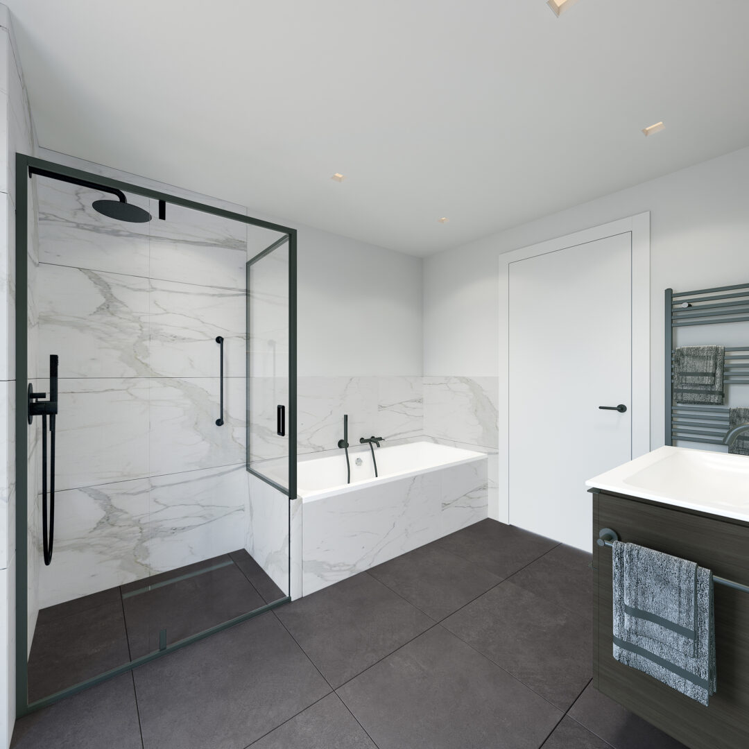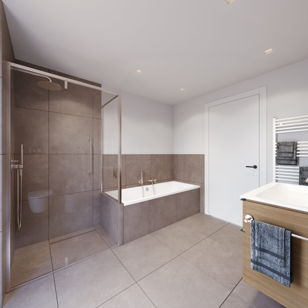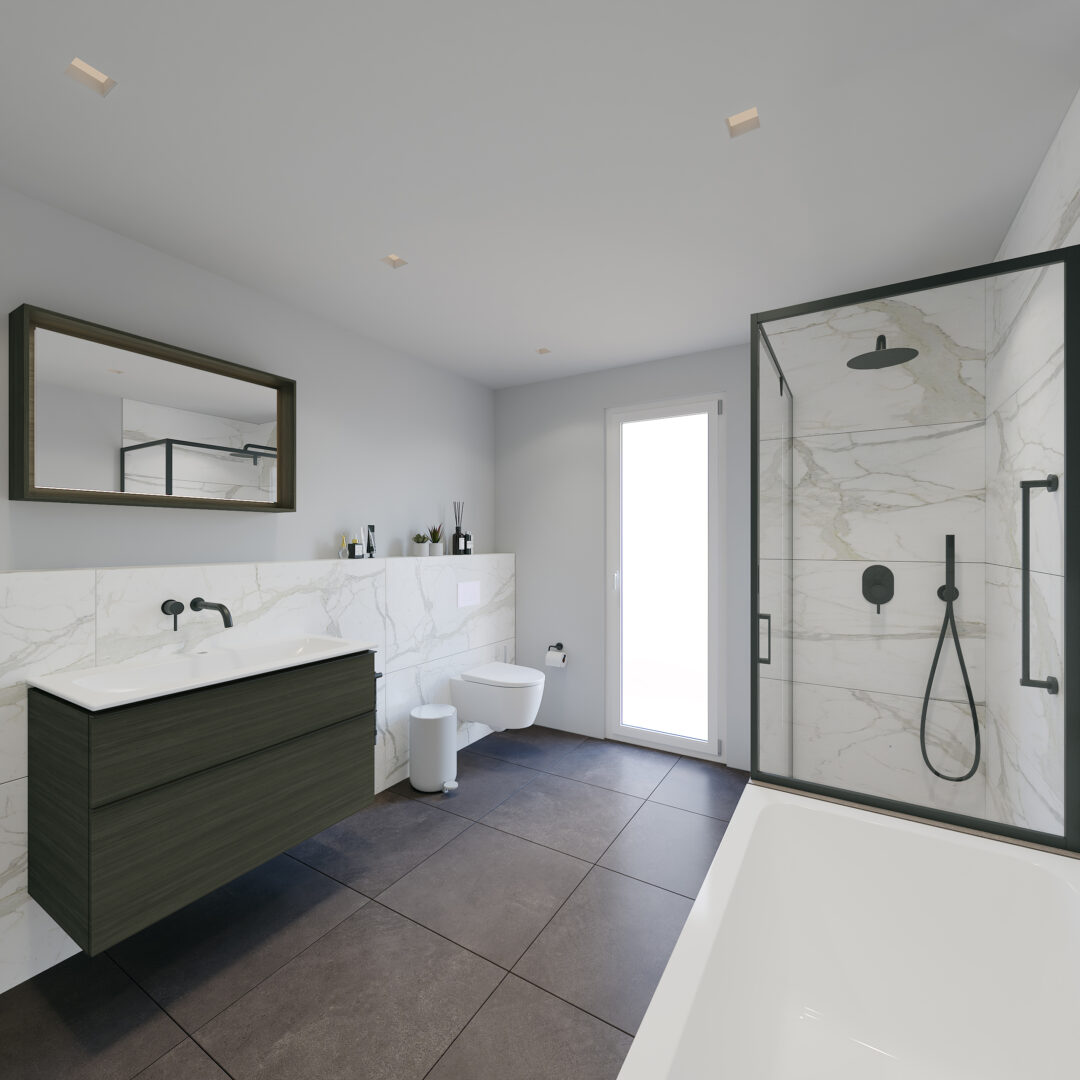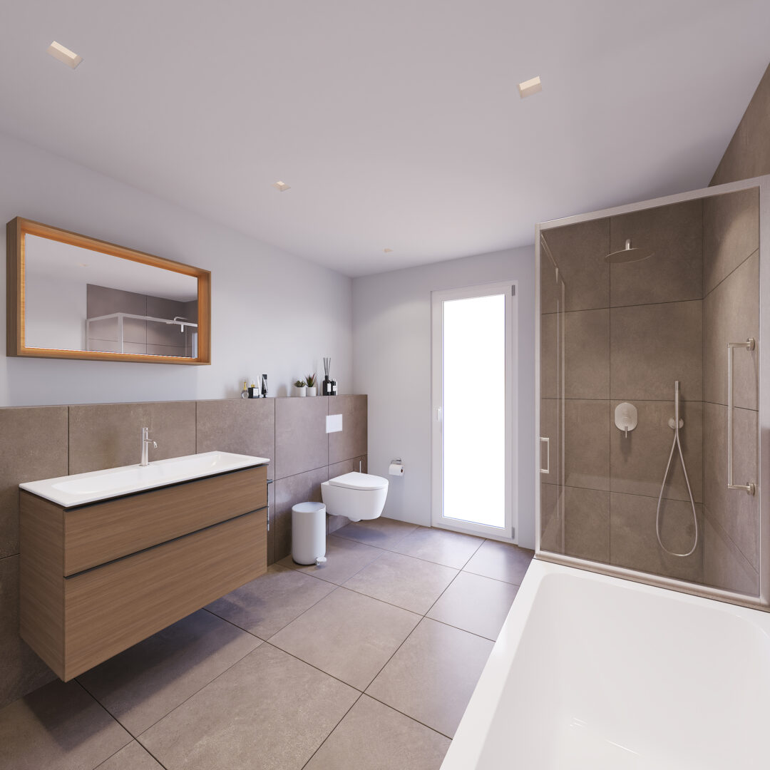 Die Bäder sind natürlich hochwertig gefliest. Auf die Materialien und Farben können Sie nach Wunsch noch Einfluss nehmen.