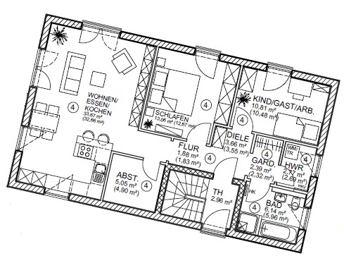 Die Wohnungen gliedern sich in zwei Erdgeschosswohnungen sowie zwei Dachgeschosswohnungen. Ergänzt werden alle Einheiten durch zusätzliche Nutzflächen innerhalb der jeweiligen Wohnung.