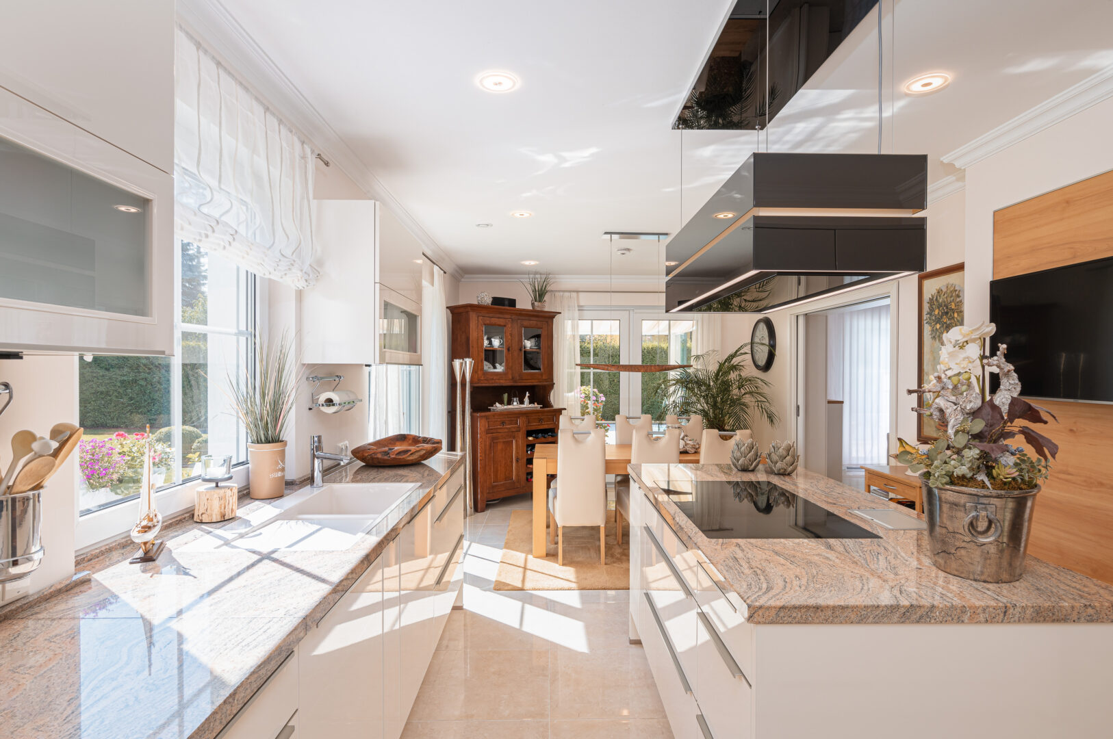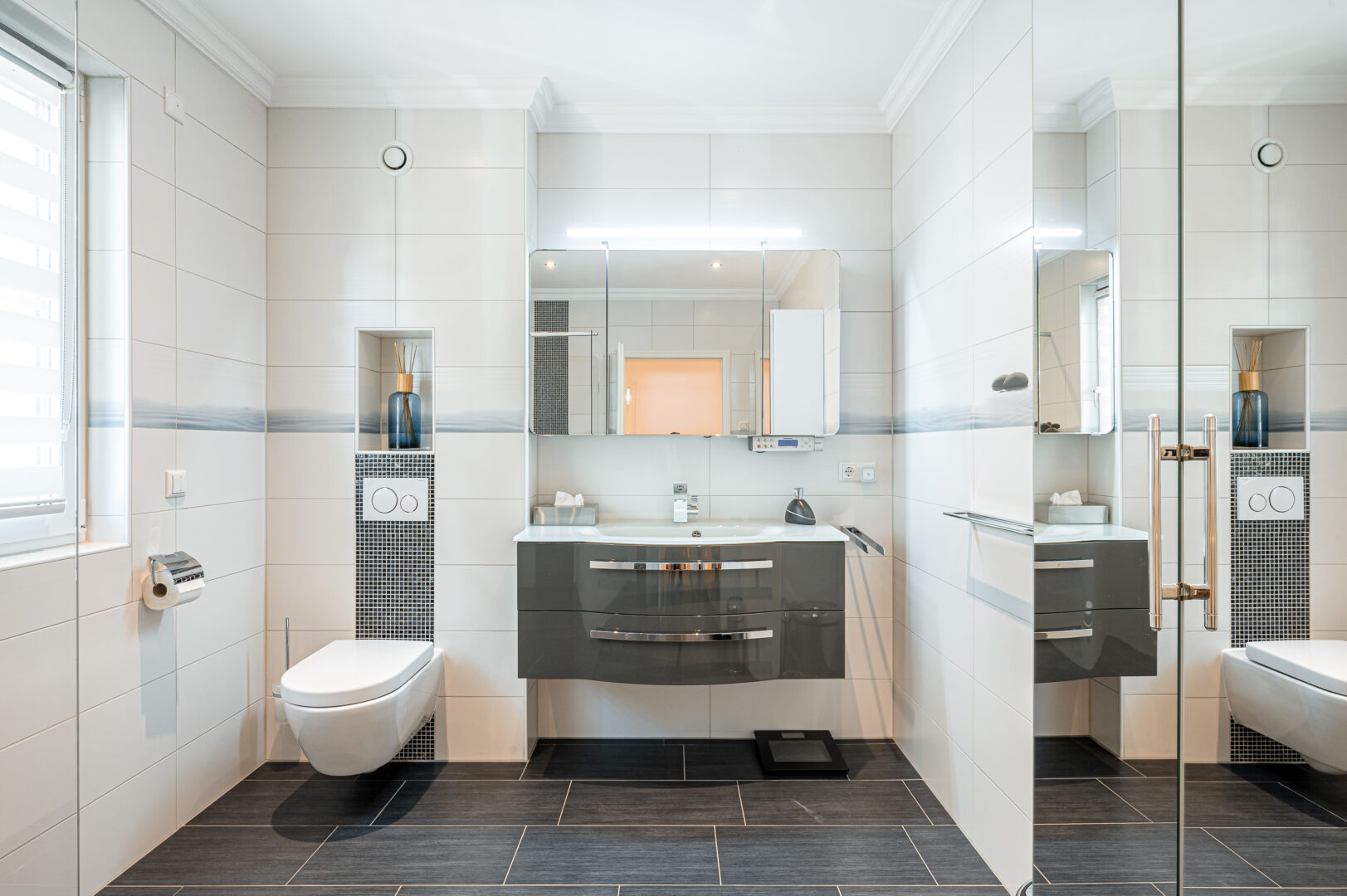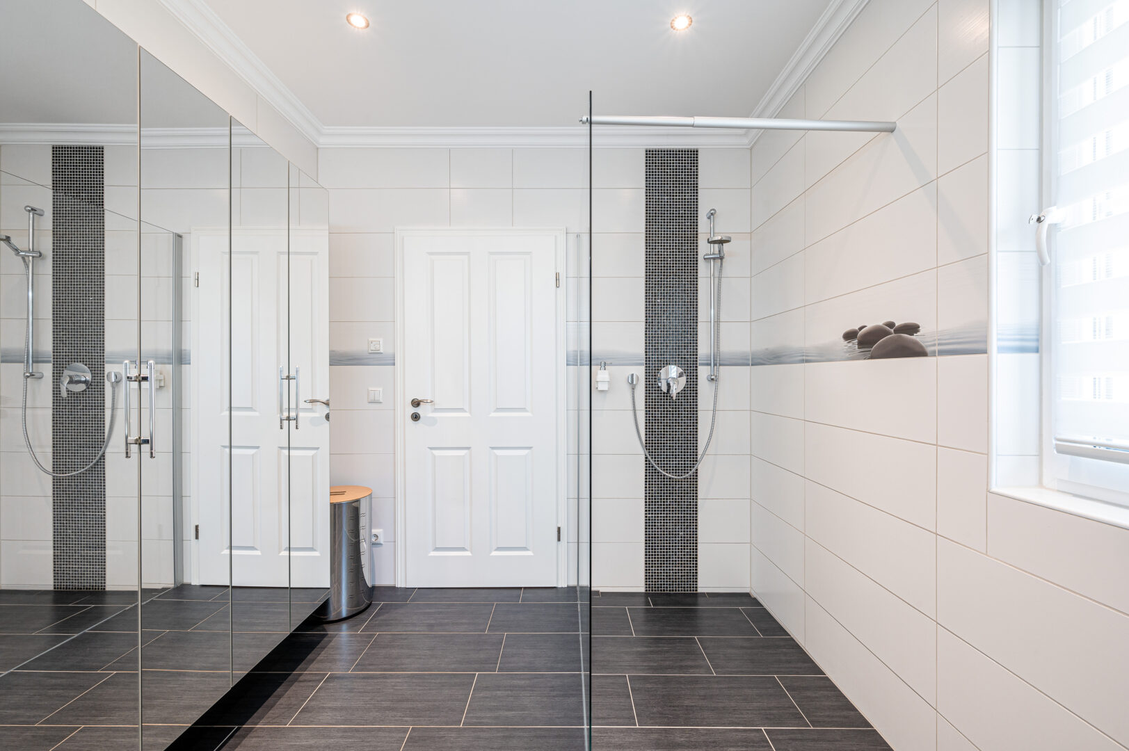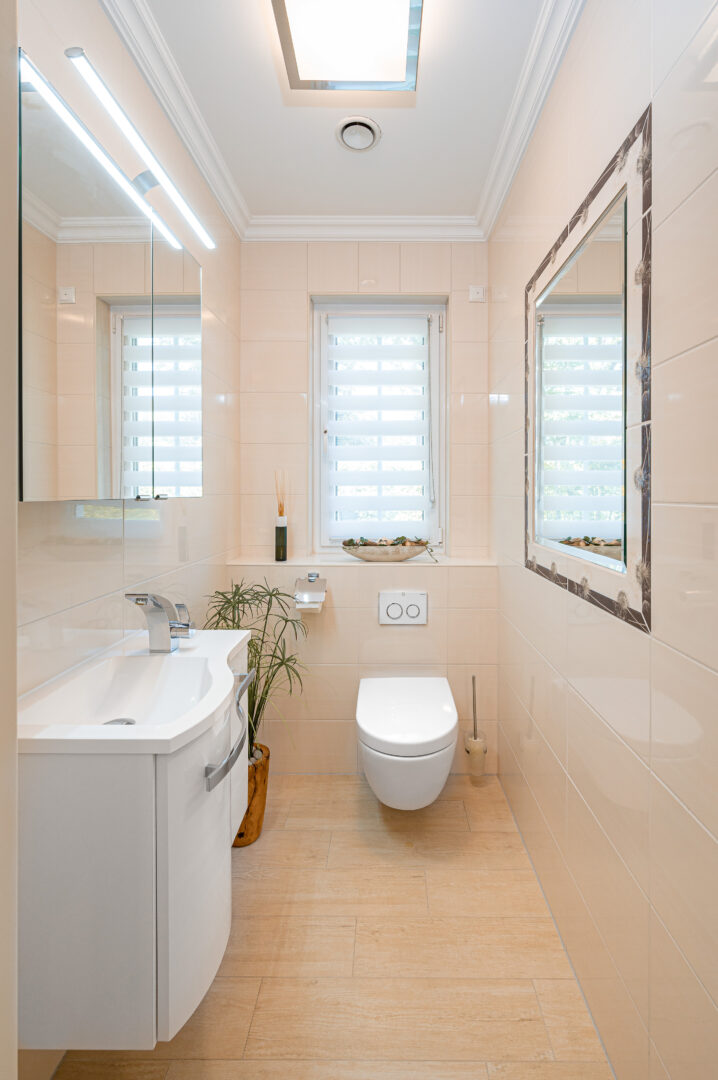 - Bäder: Insgesamt drei Bäder (ein Vollbad mit Wanne und Dusche, ein Duschbad, ein Gäste-WC).
