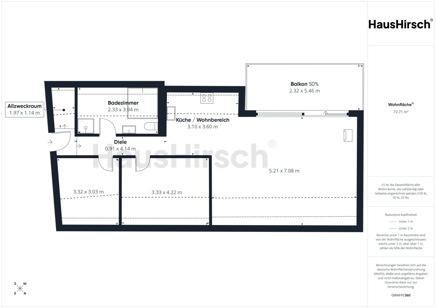 Auf ca. 72,7 m² Wohnfläche verteilen sich 3 Zimmer, darunter zwei Schlafzimmer, ein großzügiger Wohn- und Essbereich sowie ein exklusiv ausgestattetes Badezimmer. Die Wohnung liegt im Dachgeschoss und bietet mit ihrer großzügigen Dachterrasse ein echtes Highlight – einen privaten Rückzugsort mit Weitblick über die umliegende Nachbarschaft.