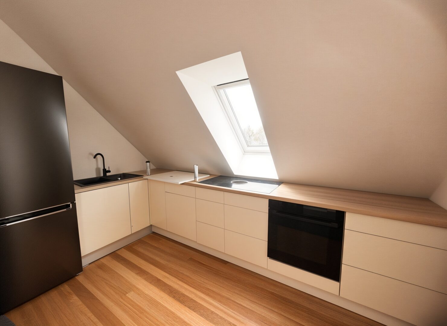 Auf ca. 72 m² Wohnfläche verteilen sich 3 Zimmer, darunter zwei Schlafzimmer, ein großzügiger Wohn- und Essbereich sowie ein exklusiv ausgestattetes Badezimmer. Die Wohnung liegt im Dachgeschoss und bietet mit ihrer großzügigen Dachterrasse ein echtes Highlight – einen privaten Rückzugsort mit Weitblick über die umliegende Nachbarschaft.