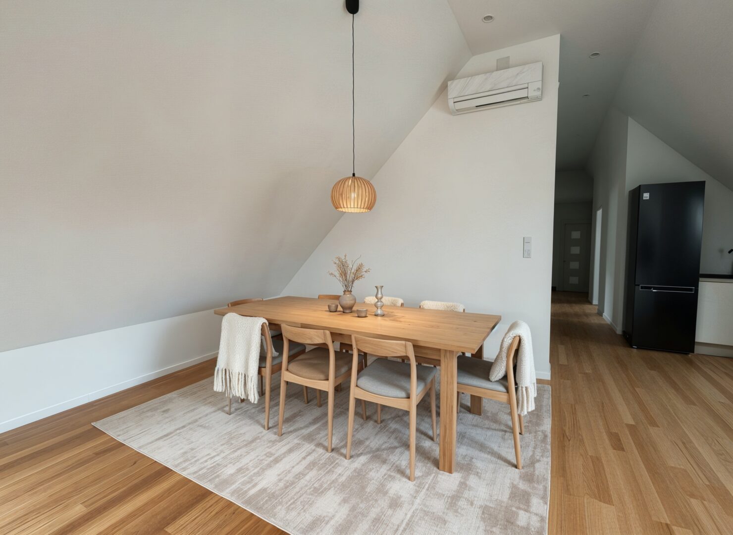 Der Wohnbereich besticht durch einen hochwertigen Eukalyptus-Vollholzboden, einen stilvollen Kamin sowie große Fensterflächen, die für ein lichtdurchflutetes Ambiente sorgen. Von hier aus besteht ein direkter Zugang zur Dachterrasse, die den Wohnraum ideal nach außen erweitert.