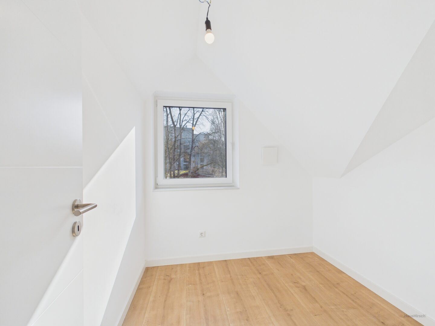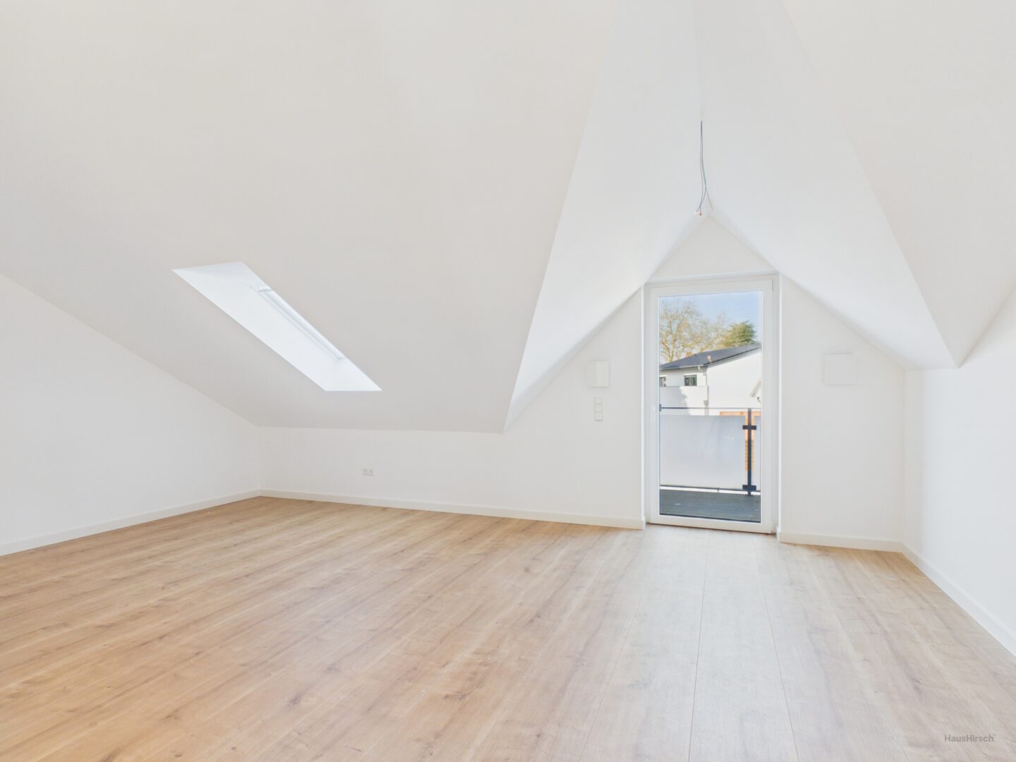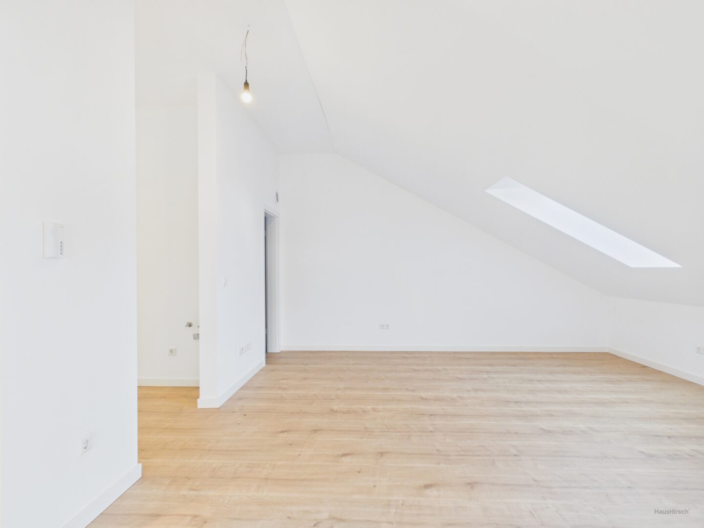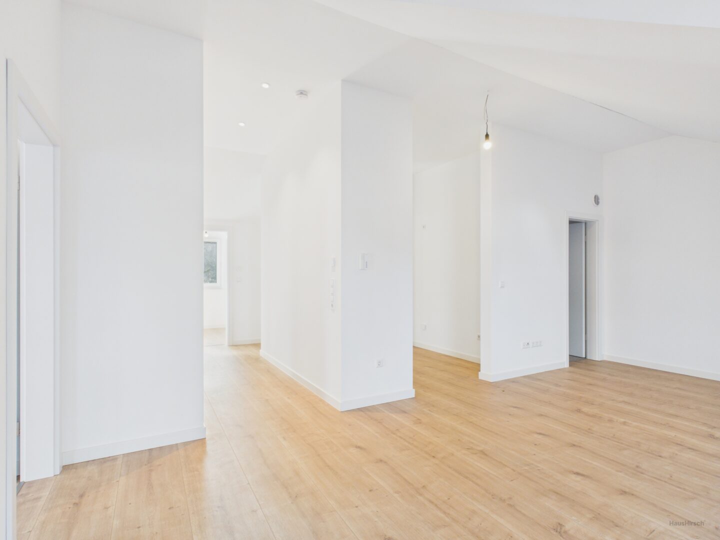 Zum Verkauf steht in diesem vier Wohneinheiten zählenden Neubau-Doppelhaus nur noch eine Dachgeschoss-Wohnung mit eigenem privaten Eingang. Der Eingang ist im Erdgeschoss, mit Abstellraum und Garderobe, die Wohnung im Obergeschoss.