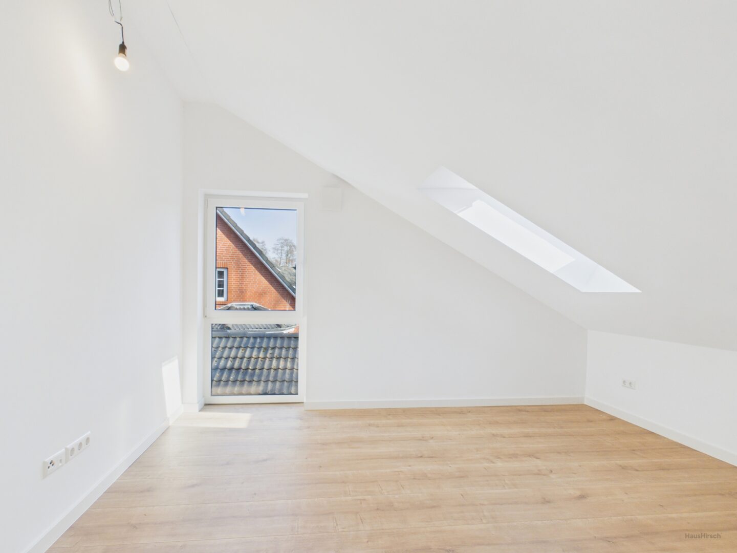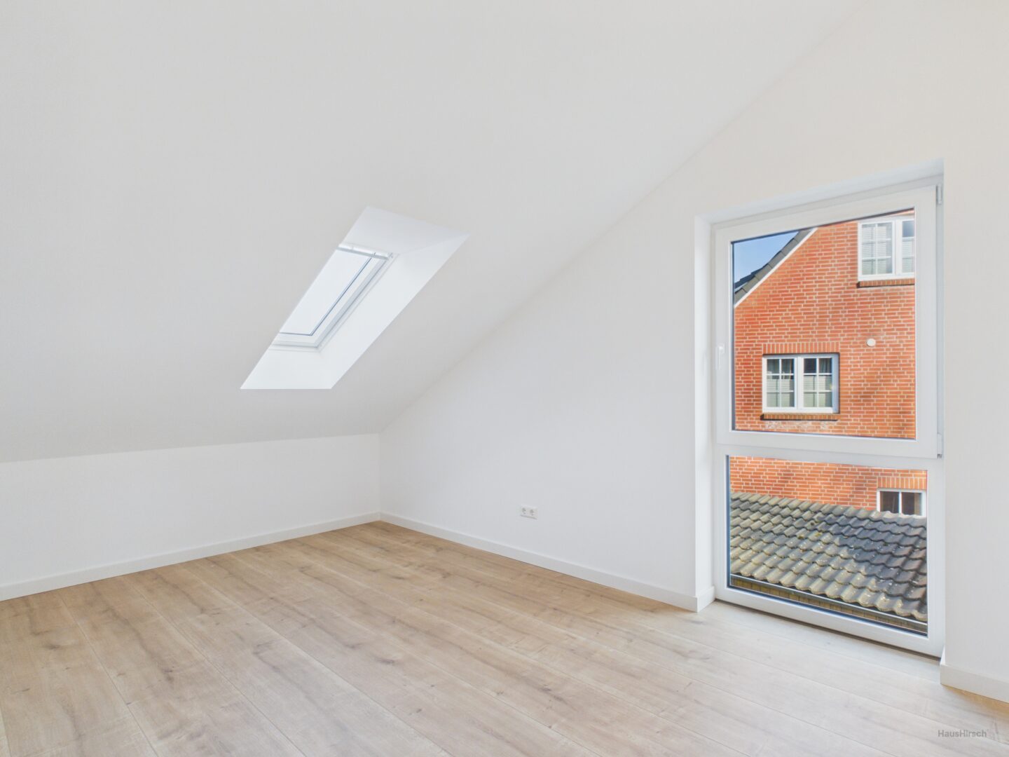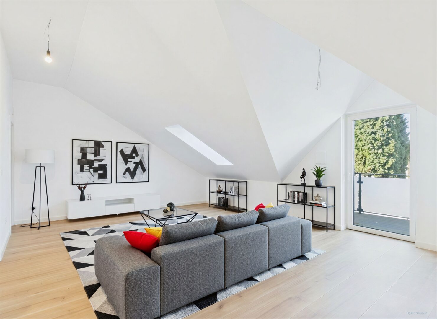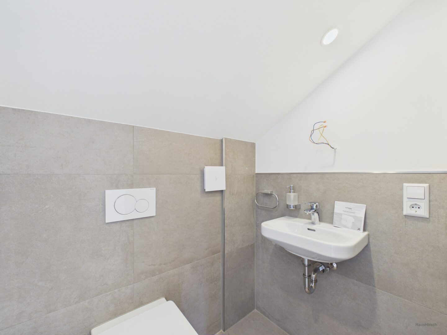 Zum Verkauf steht in diesem vier Wohneinheiten zählenden Neubau-Doppelhaus nur noch eine Dachgeschoss-Wohnung mit eigenem privaten Eingang. Der Eingang ist im Erdgeschoss, mit Abstellraum und Garderobe, die Wohnung im Obergeschoss.