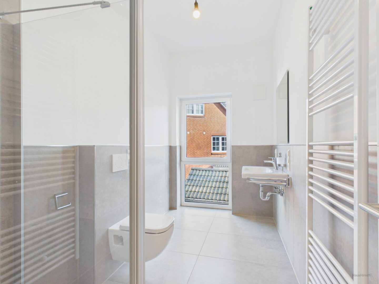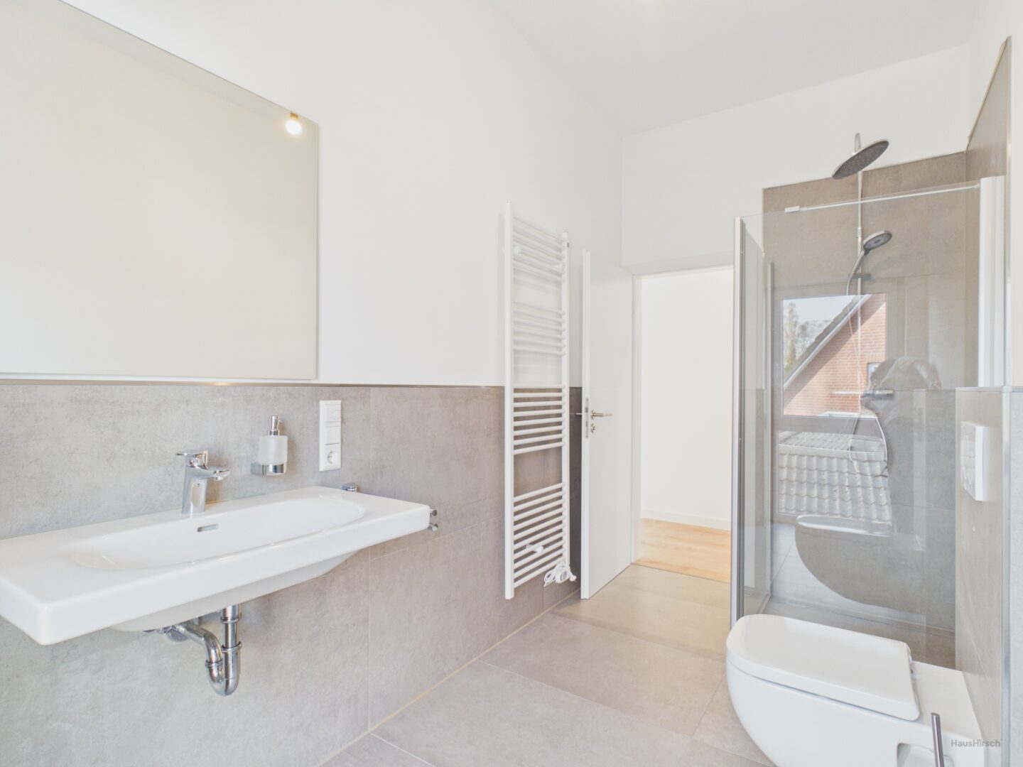 - moderne Badausstattung mit extra großen Feinsteinzeugfliesen, bodengleicher Dusche, Glasabtrennung und Fenster