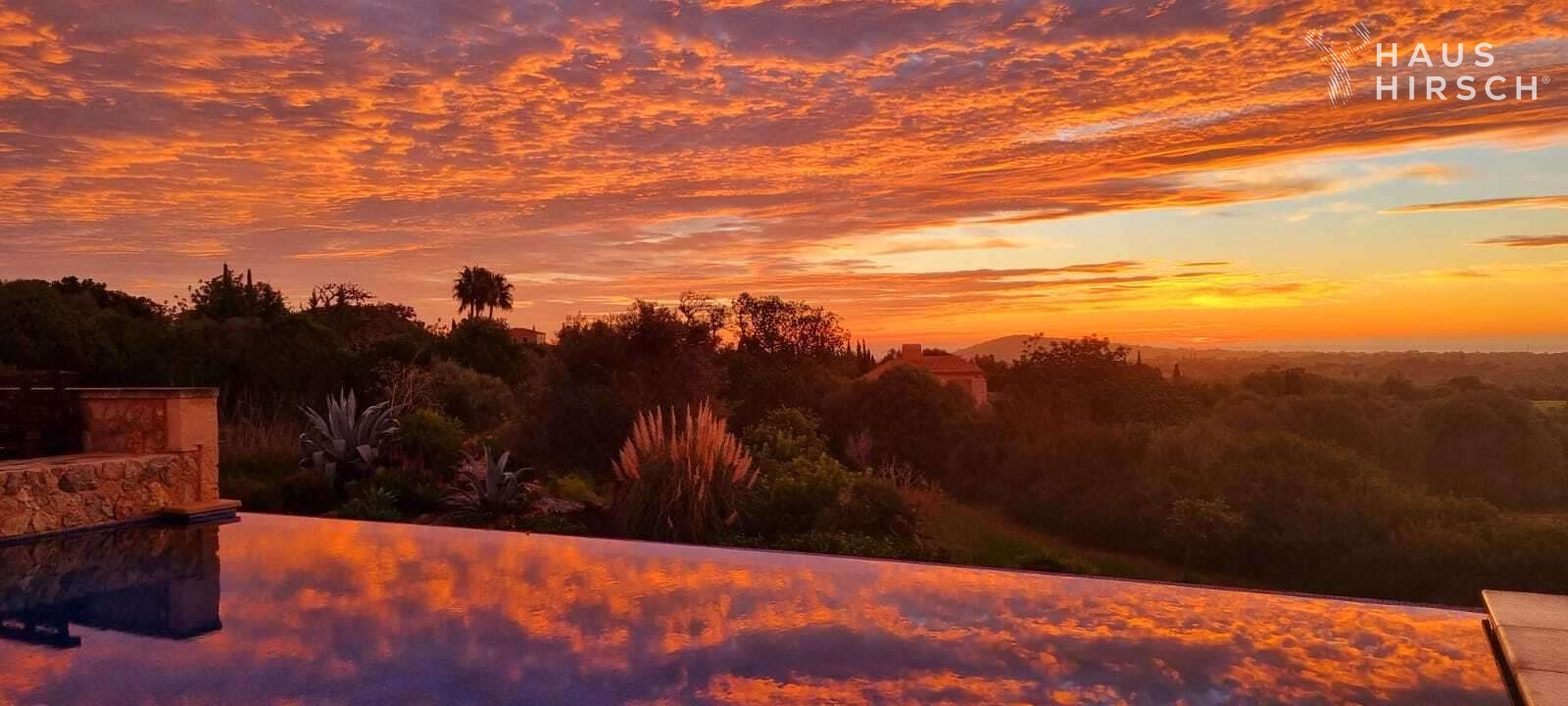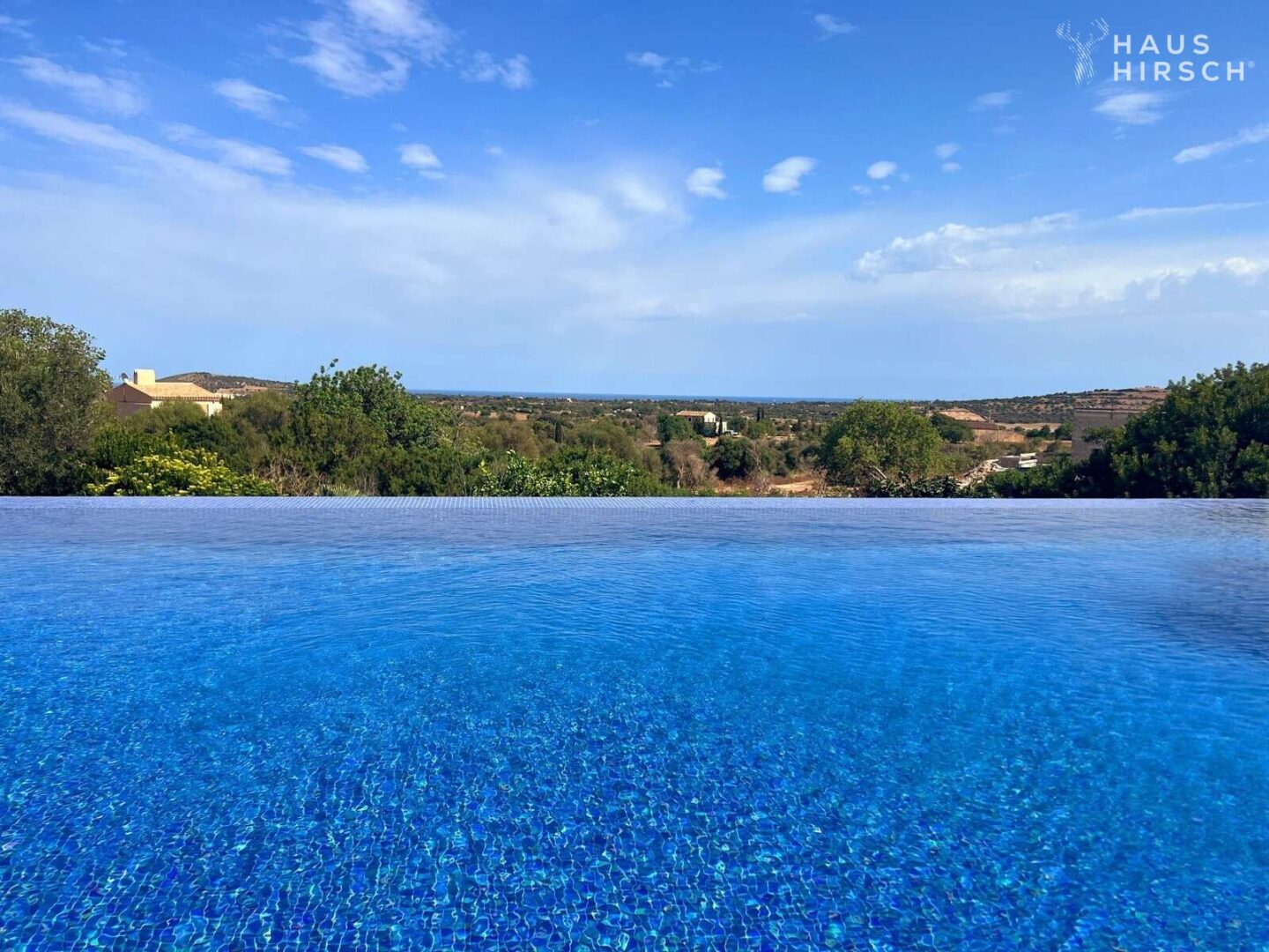 Der beheizbare Infinitypool mit freiem Blick zum Meer bildet das Herzstück des Außenbereichs. Eine Terrasse unter einem alten Johannisbrotbaum sorgt für Schatten, während Rasenflächen mit Bewässerungssystem, ein Wasserfall, eine Bar mit Holzofen und großzügige Sonnenterrassen zum Entspannen und Feiern einladen.