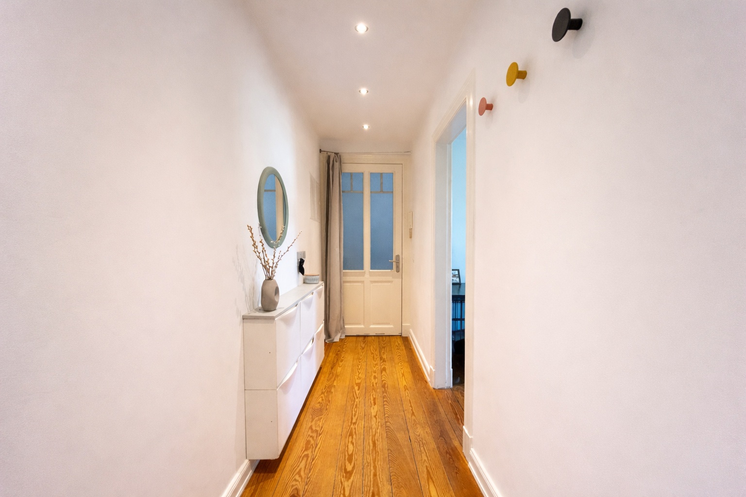Besonderen Charme verleihen die sorgfältig aufgearbeiteten Pitchpine-Dielen, die geschliffen und neu geölt wurden und dem Zuhause eine warme, hochwertige Ausstrahlung verleihen. Die durchschnittliche Deckenhöhe von ca. 2,64 m unterstreicht zusätzlich das luftige Wohngefühl.