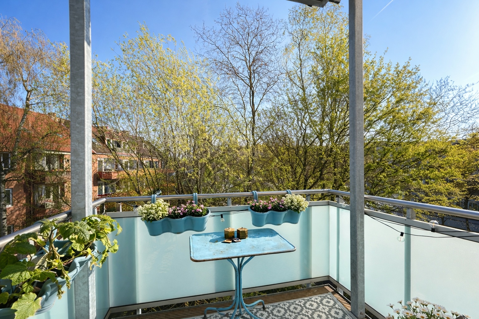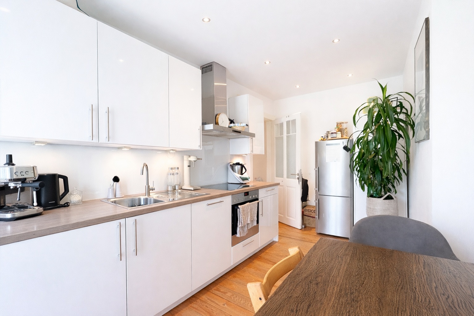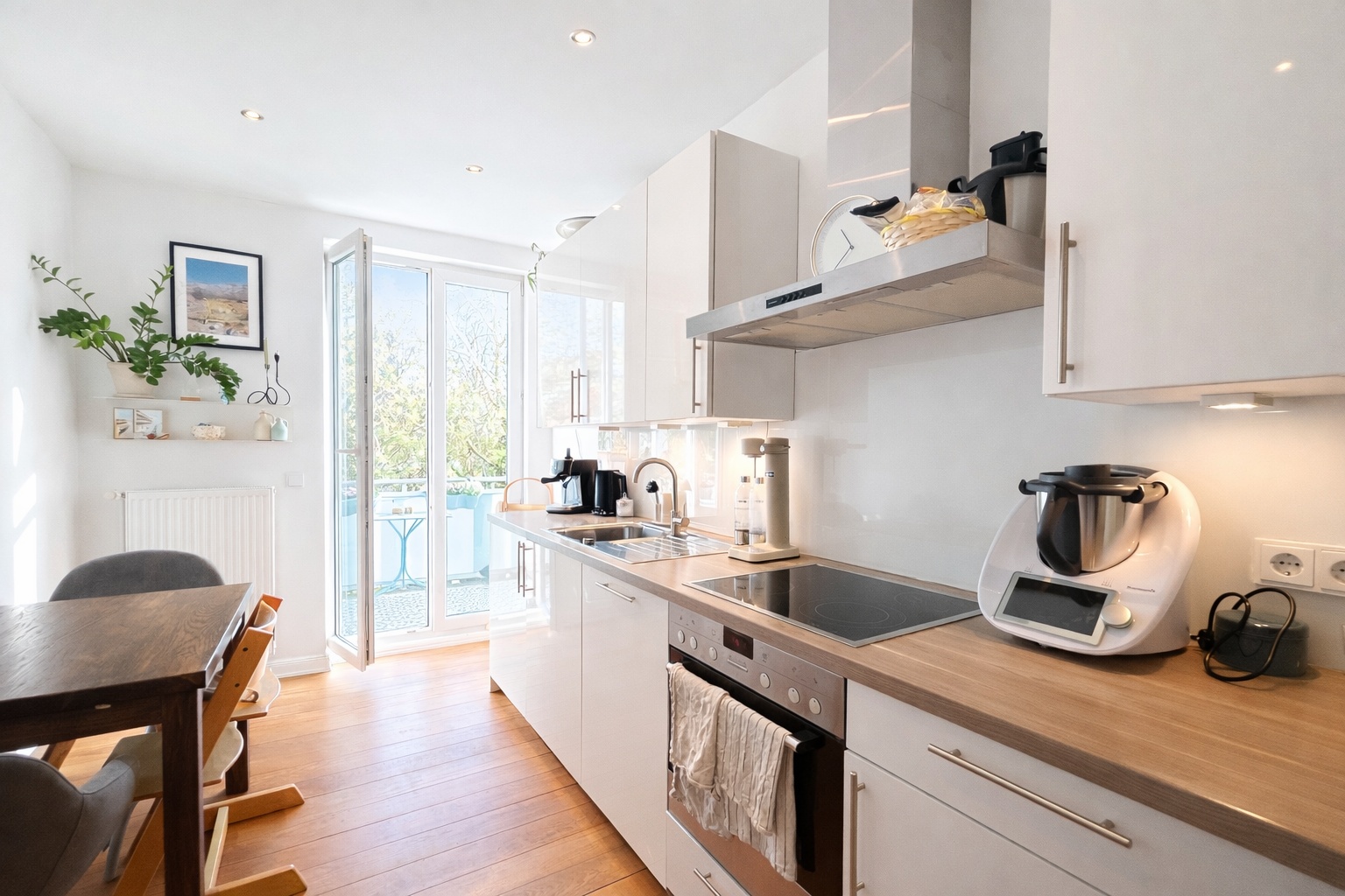 Ein echtes Herzstück der Wohnung ist die großzügige Küche, die weit mehr als nur funktionalen Raum bietet: Hier finden sowohl eine kleine Familie als auch WG-Bewohner ausreichend Platz für gemeinsames Kochen, Essen und gesellige Stunden. Direkt angrenzend befindet sich der ca. 3,1 m² große Balkon, dessen praktische, quadratische Form selbst ein entspanntes Frühstück zu viert ermöglicht – ein schöner Rückzugsort mitten in der Stadt.