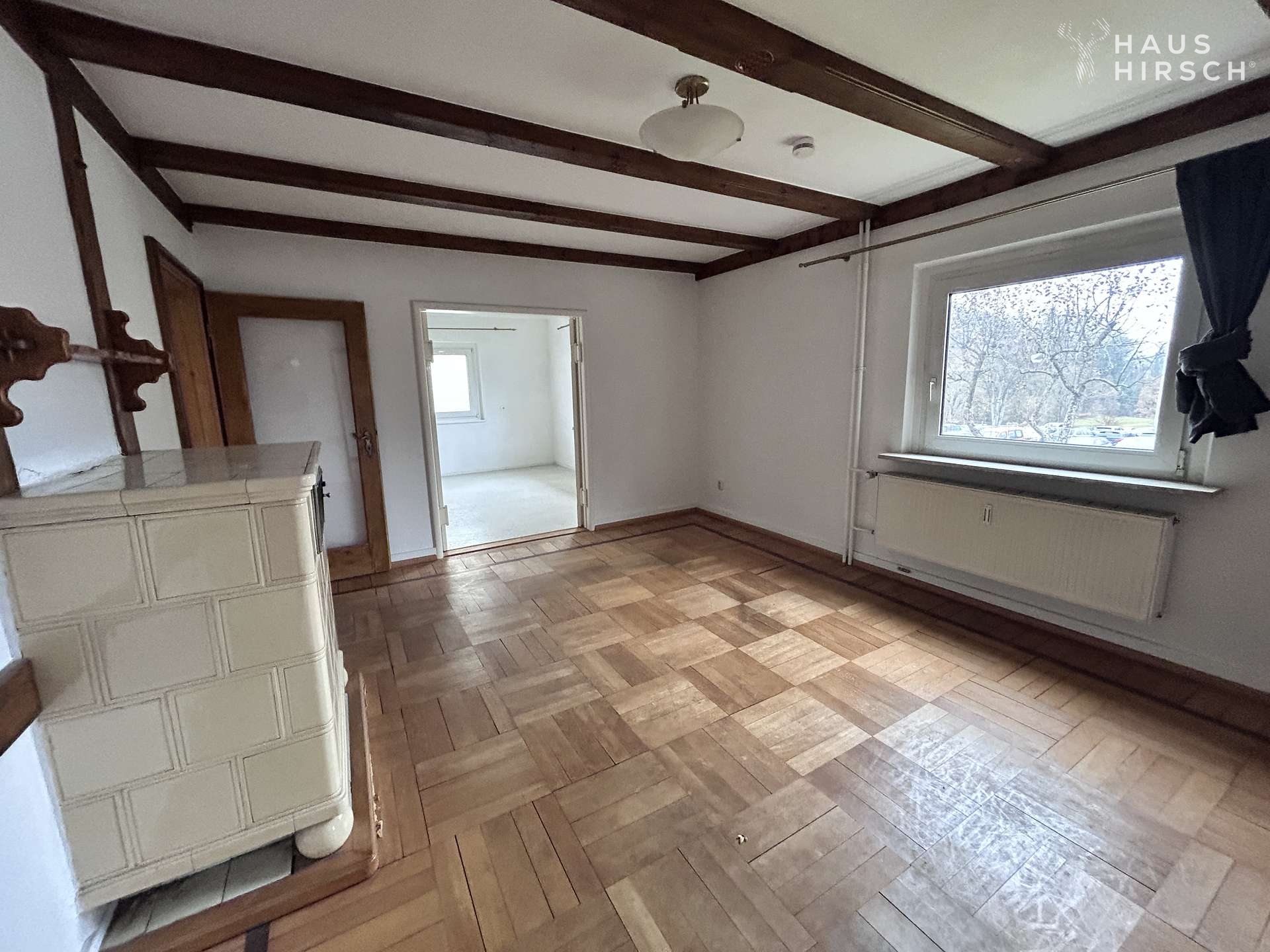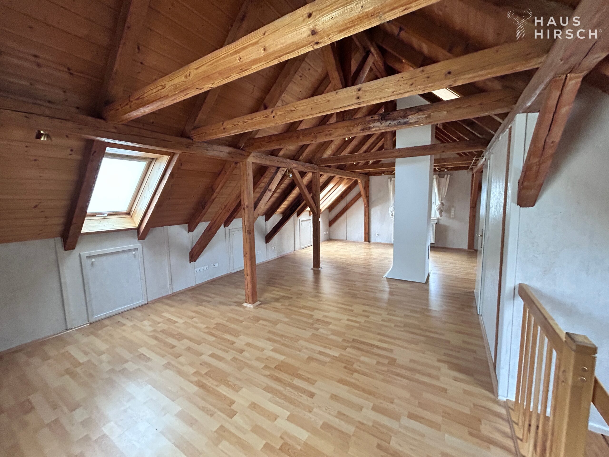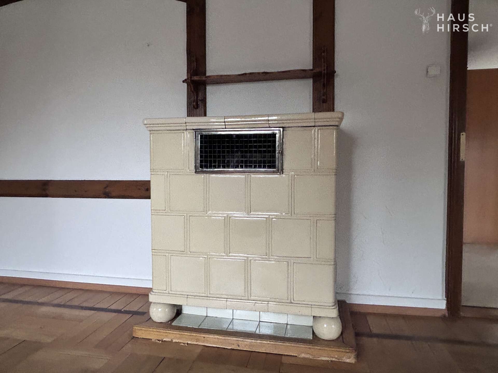 Im Inneren sorgt ein klassischer Kachelofen für behagliche Wärme und eine angenehme Wohnatmosphäre. Die Raumaufteilung über drei Etagen ist großzügig und flexibel, wobei besonders das traumhafte Dachzimmer mit offenen Balken und Schlossblick beeindruckt.