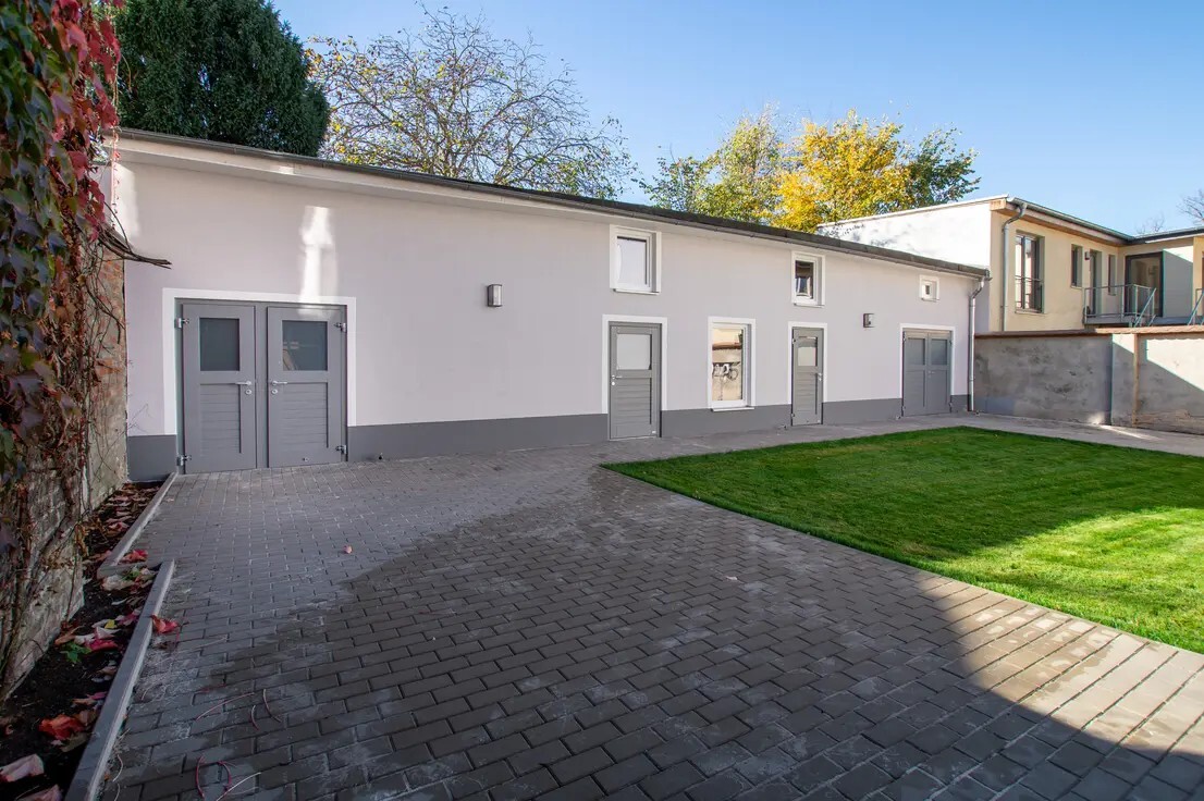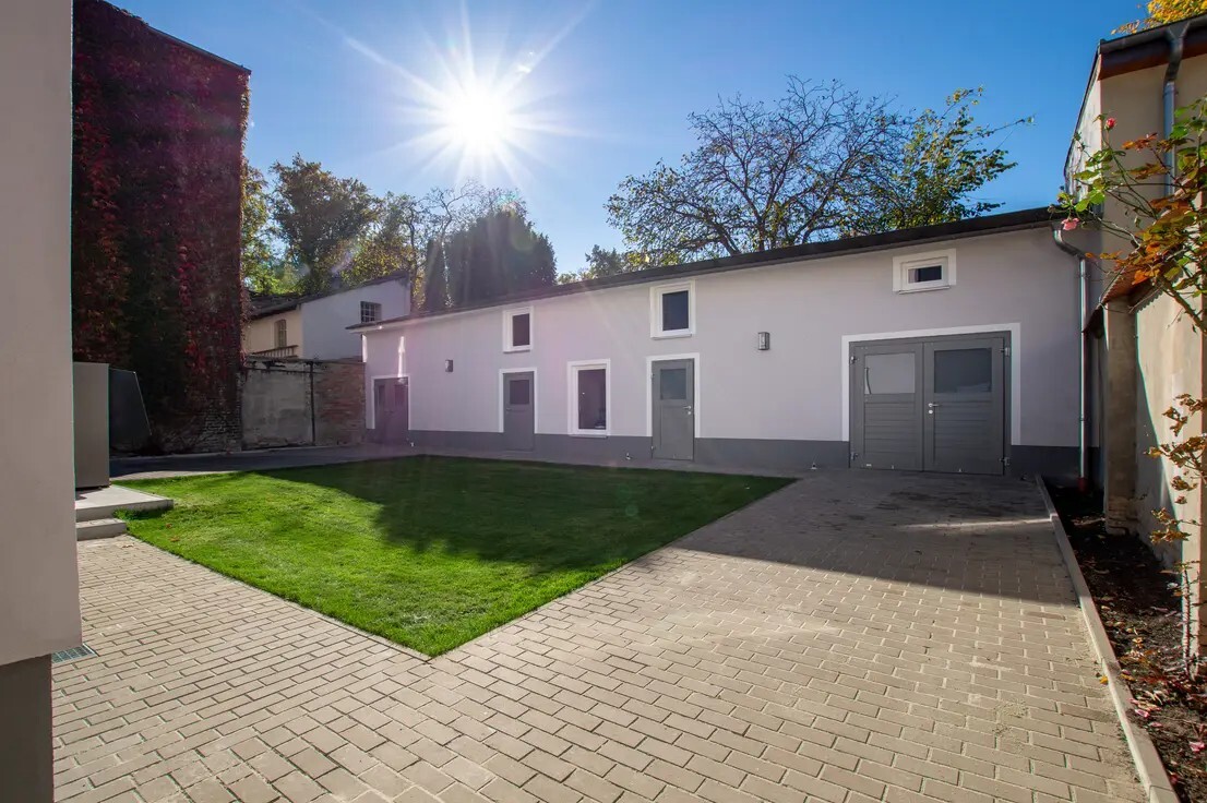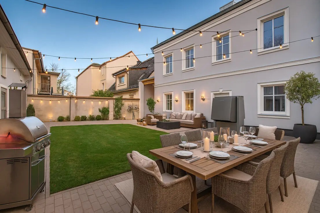 * Außenbereich: Gepflegter Garten und Hofbereich.