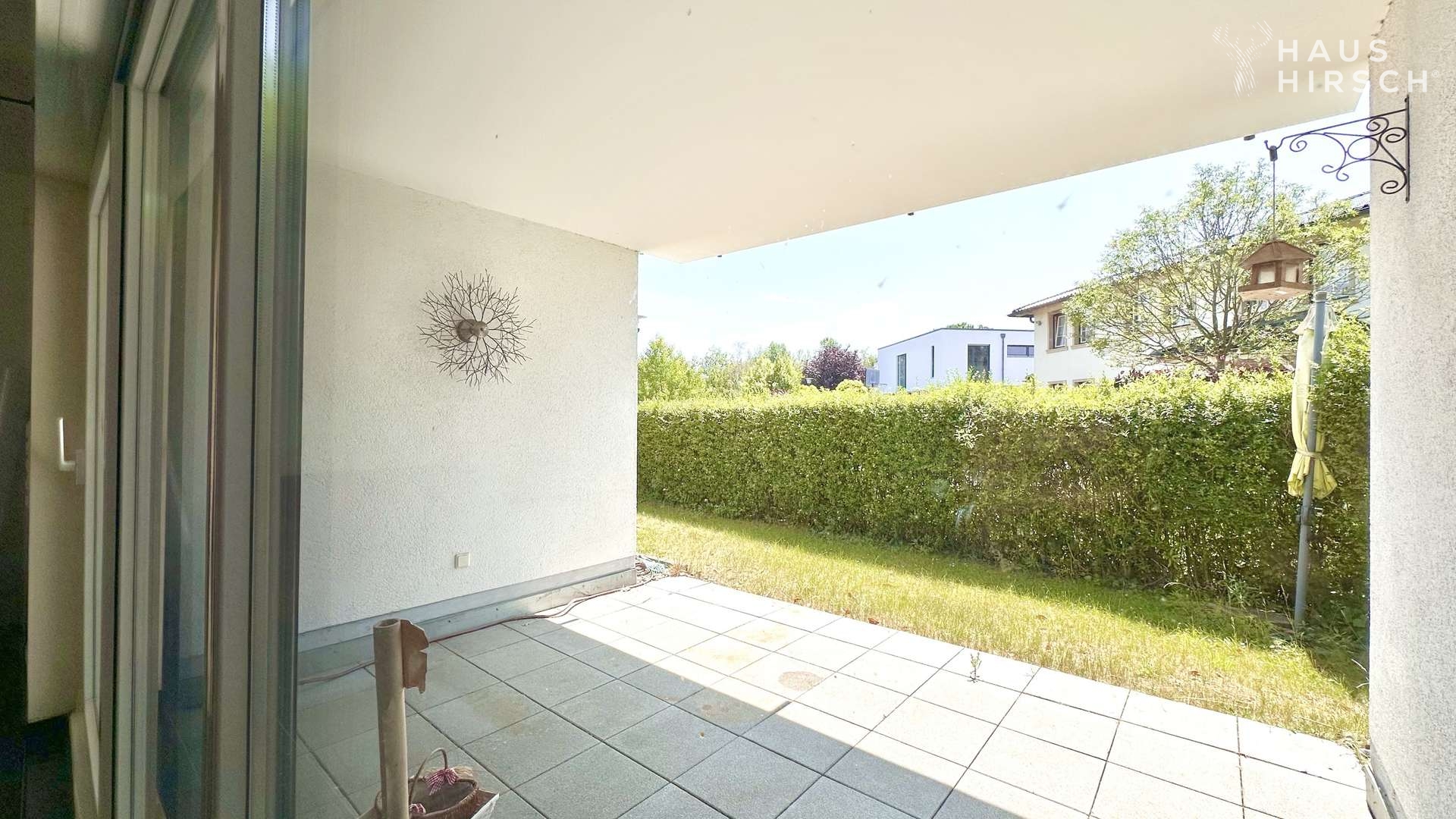 Vom Wohn- und Essbereich aus gelangt man zunächst auf eine überdachte Terrasse, die nahtlos in den privaten Garten übergeht.