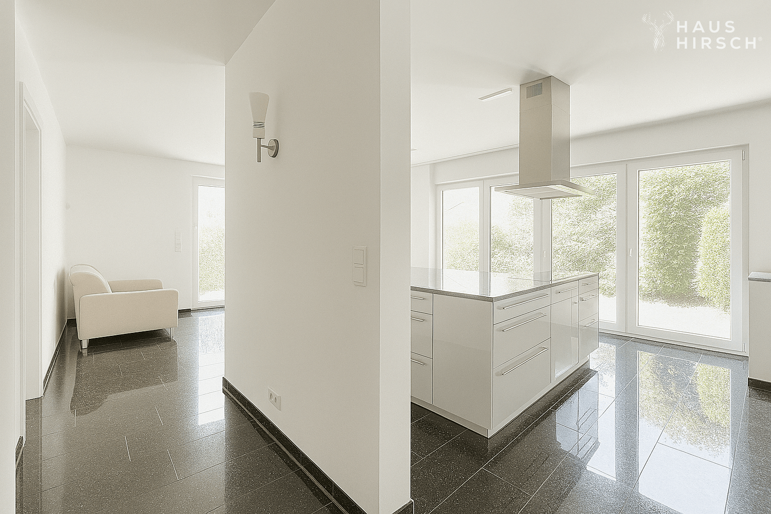 Der durchgängig verlegte Granitboden unterstreicht die solide Qualität des Hauses. Fußbodenheizung in allen Räumen, elektrische Rollläden und große Fensterflächen sorgen für Behaglichkeit und Licht.