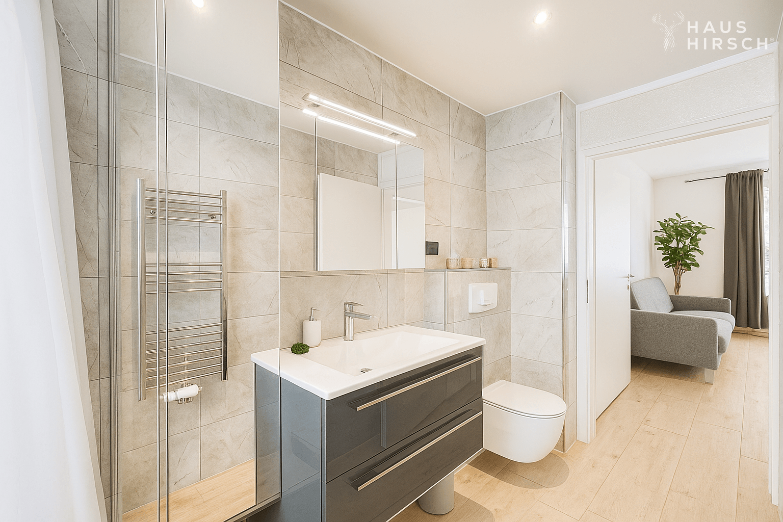 - stilvolles Designerbad (2024) mit Walk-in-Dusche, italienischen Fliesen und Möbeln von B-Collection