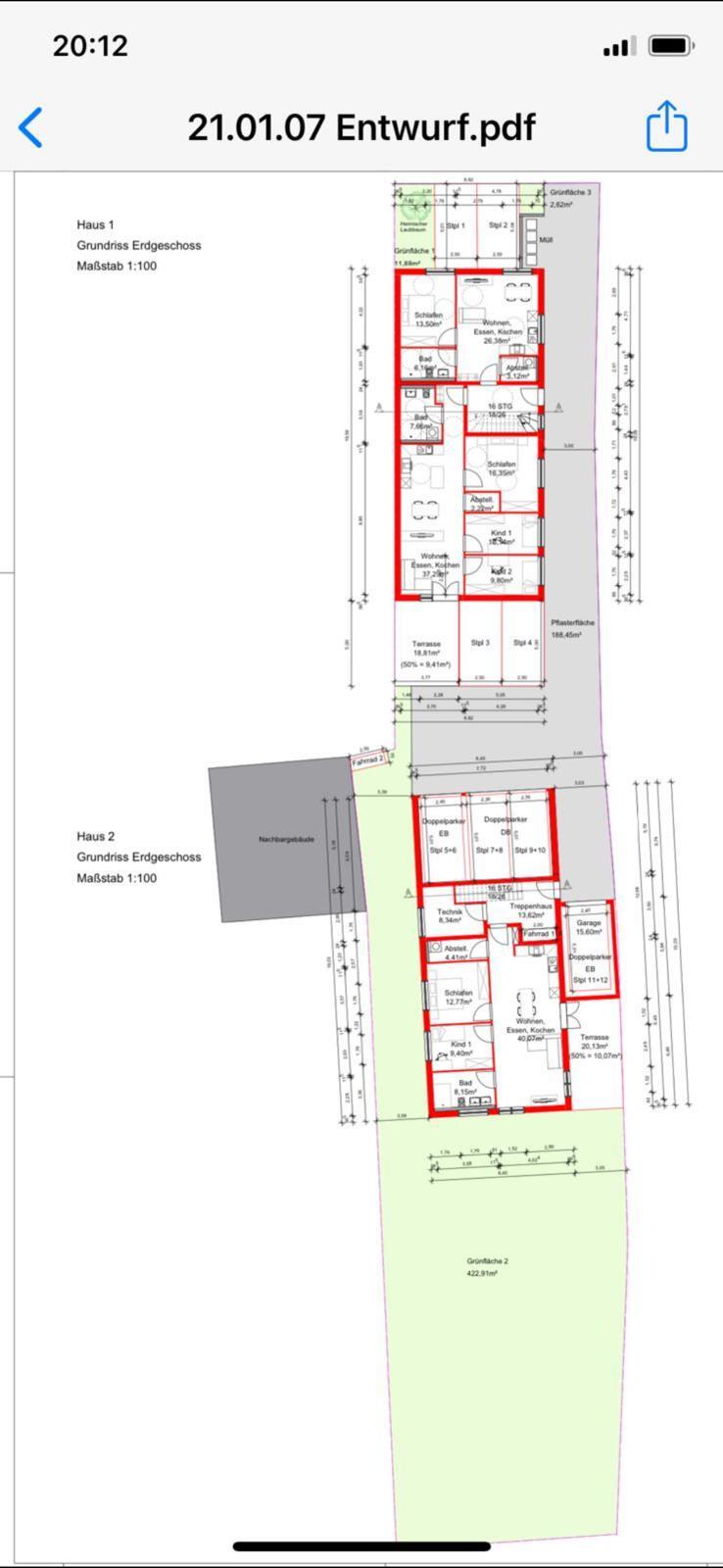 Besonders attraktiv: Auf dem großzügigen Grundstück befinden sich zwei Hallen, die vielfältige Nutzungsmöglichkeiten eröffnen. Dahinter liegt ein großer Bauplatz, für den bereits ein Plan zum Bau eines weiteren Mehrfamilienhauses existiert – ideal für Investoren oder Bauträger, die die einmalige Lage nutzen möchten.